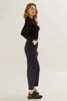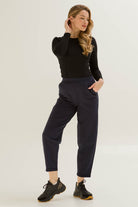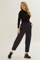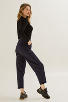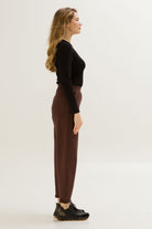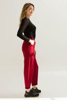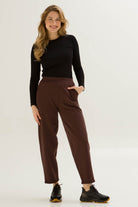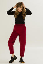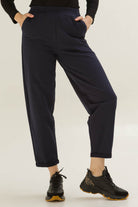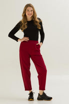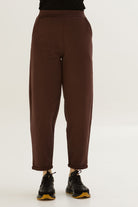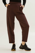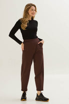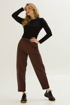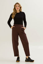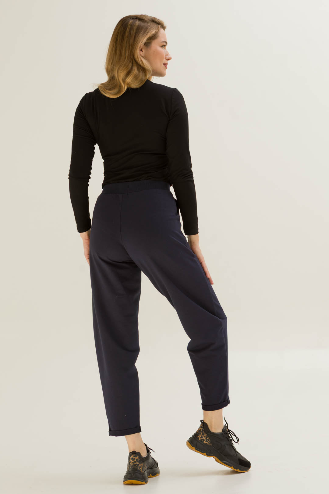 Krój typu marchewka, z luźniejszymi nogawkami u góry i zwężającymi się ku dołowi, pięknie podkreśla sylwetkę, jednocześnie nie ograniczając ruchów. Elastyczna guma w pasie idealnie dopasowuje się do talii, a kieszenie w szwach bocznych dodają praktyczności.
