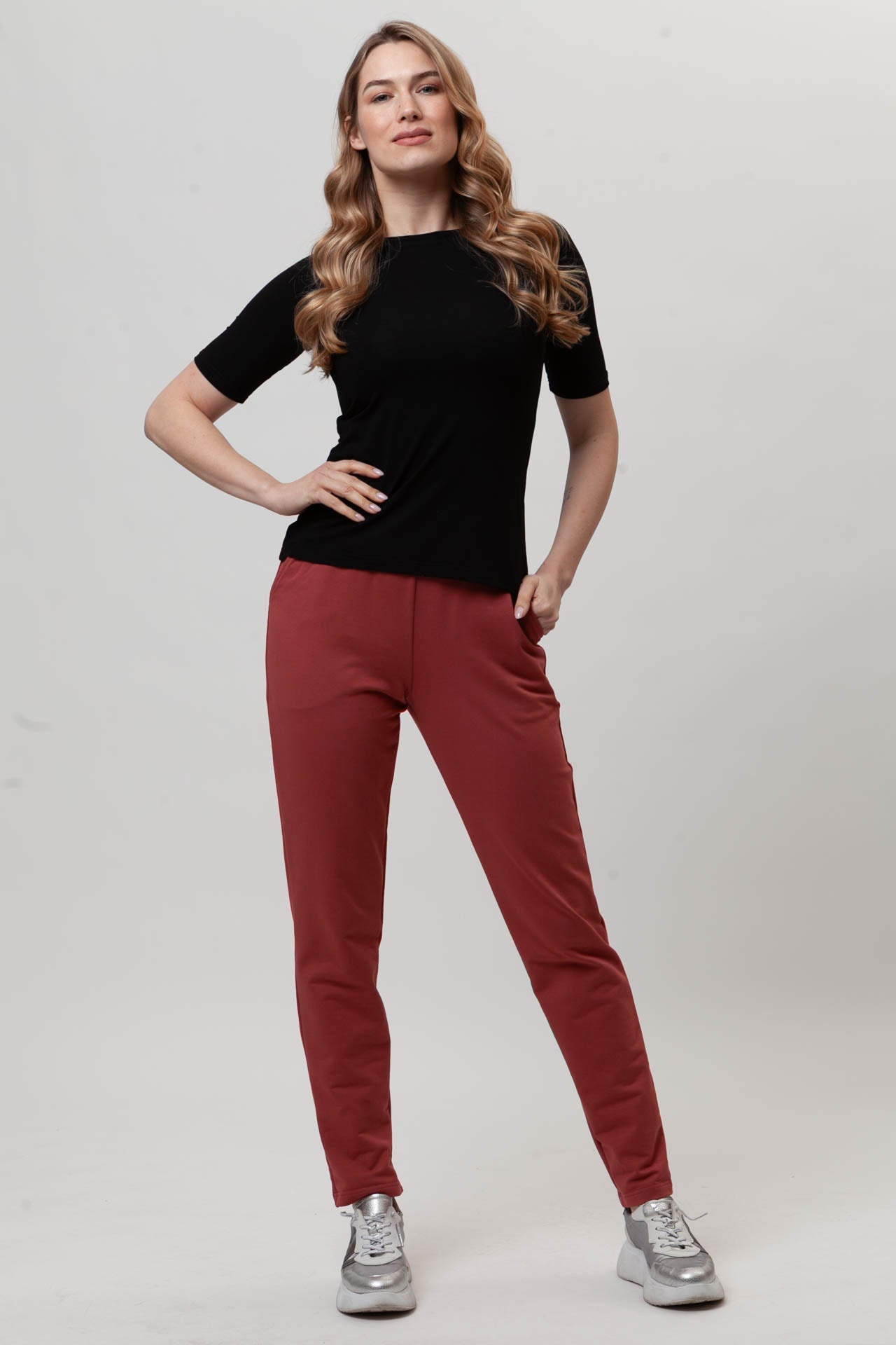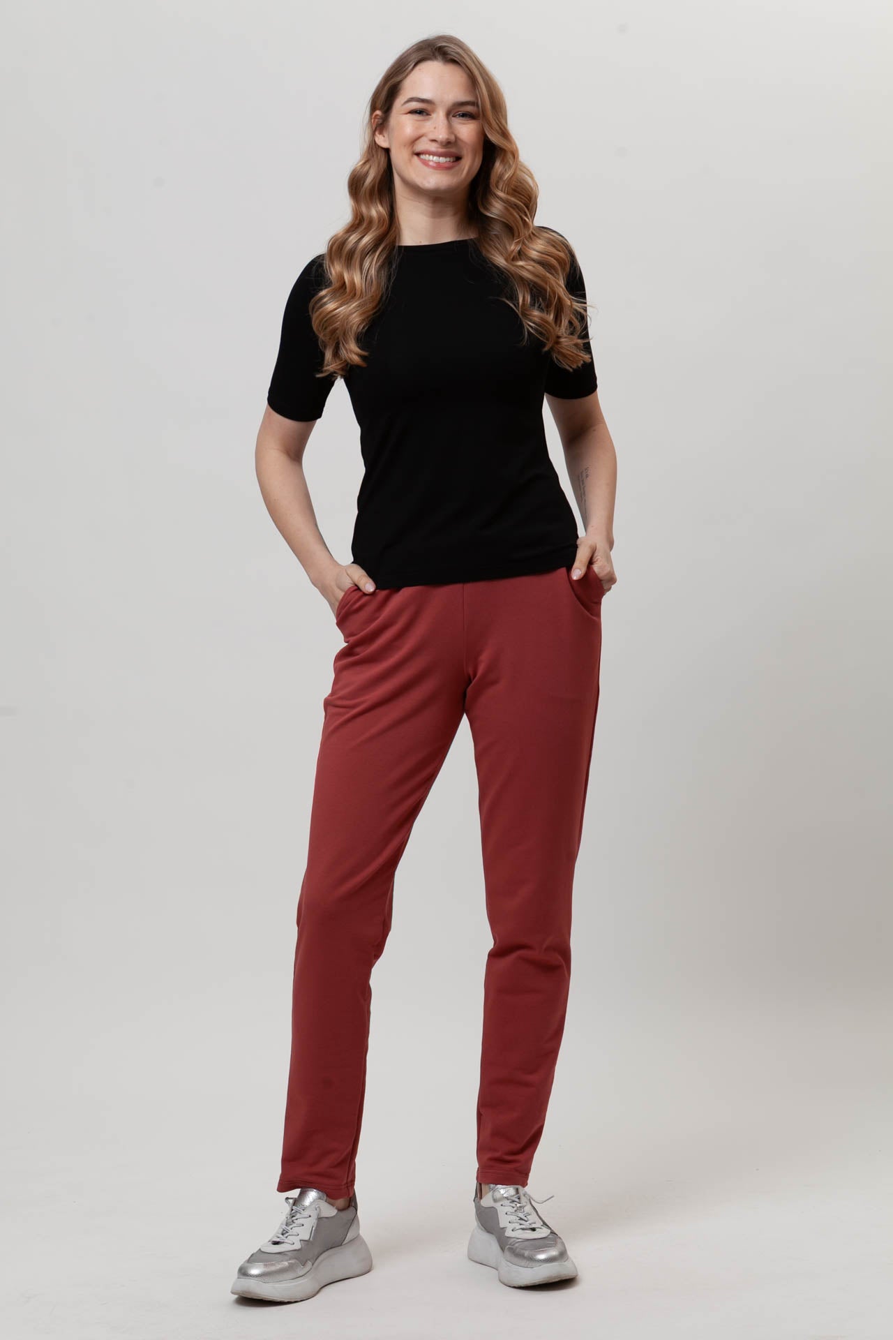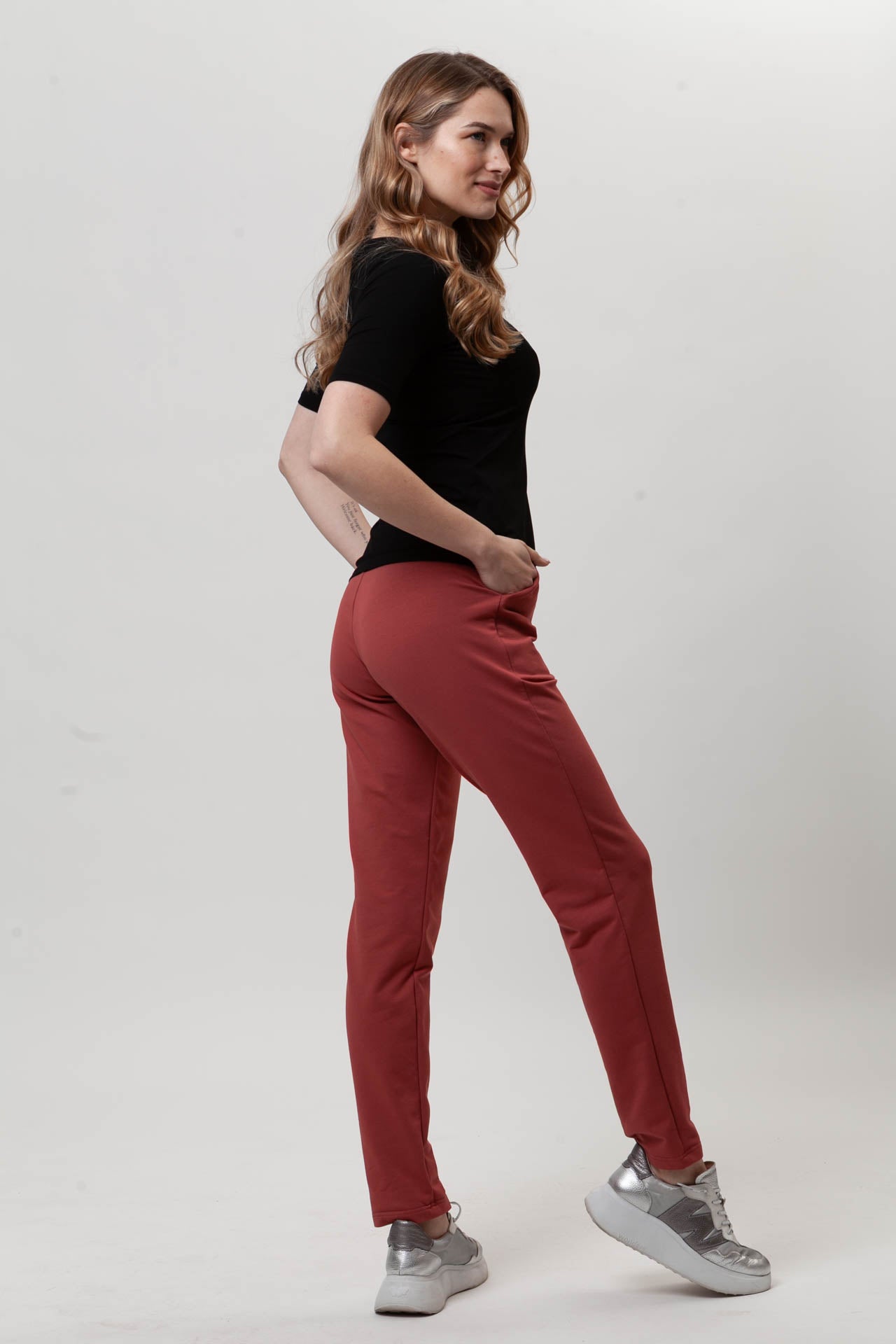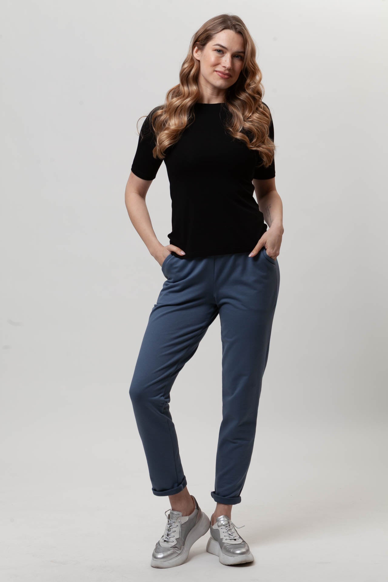 Spodnie FIT to wygodny, codzienny model, który łatwo dopasowuje się do sylwetki. Uszyte z miękkiej, oddychającej bawełny z dodatkiem elastanu (97% bawełna, 3% elastan), zapewniają komfort noszenia przez cały dzień. Dopasowana nogawka dobrze układa się na nodze, a możliwość samodzielnej regulacji długości pozwala dopasować spodnie do wzrostu. Elastyczny pas z gumą nie uciska i rozciąga się do 8 cm. Subtelna kieszeń i prosty fason sprawiają, że spodnie FIT świetnie sprawdzą się w codziennych, swobodnych stylizacjach.