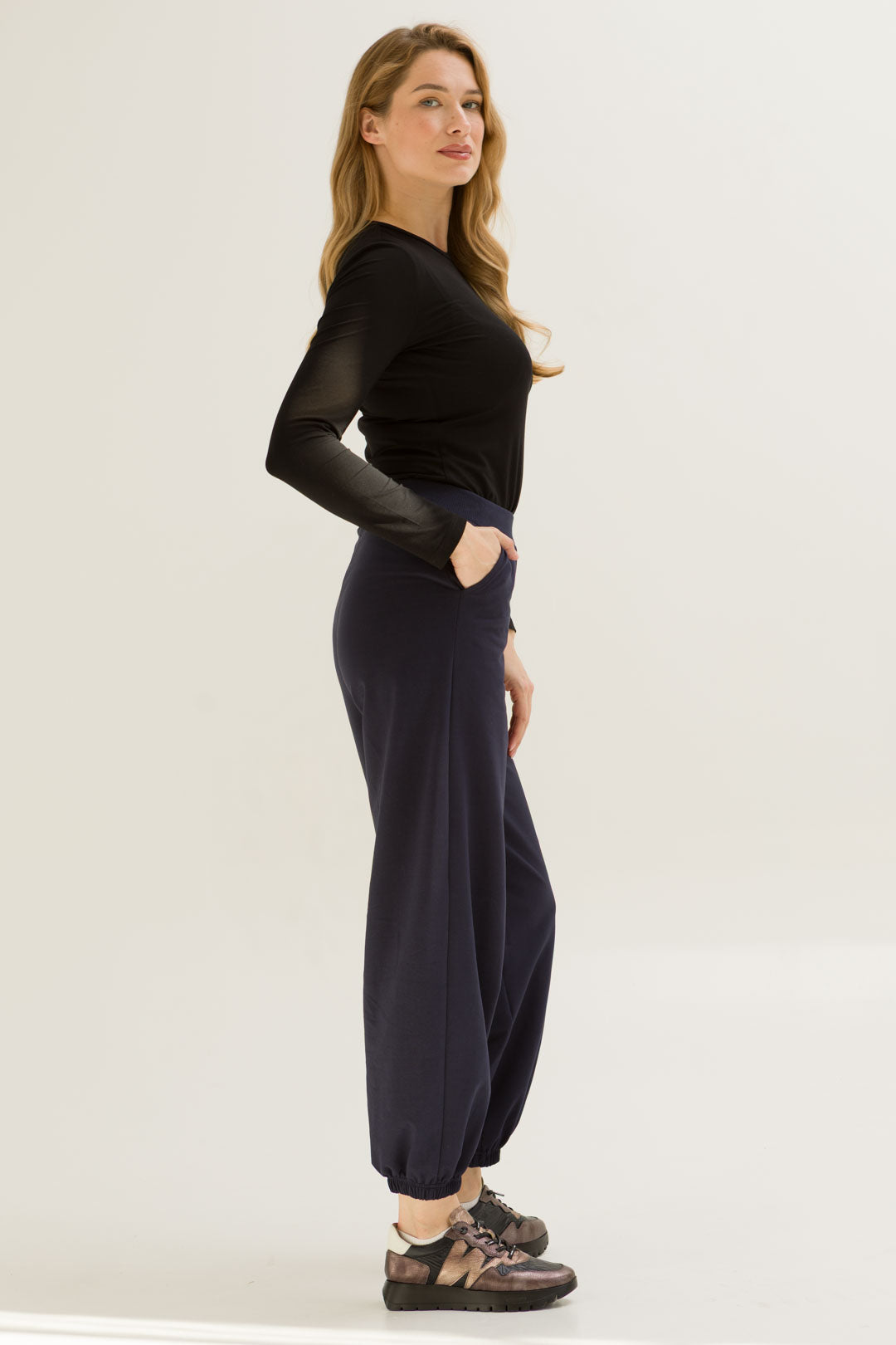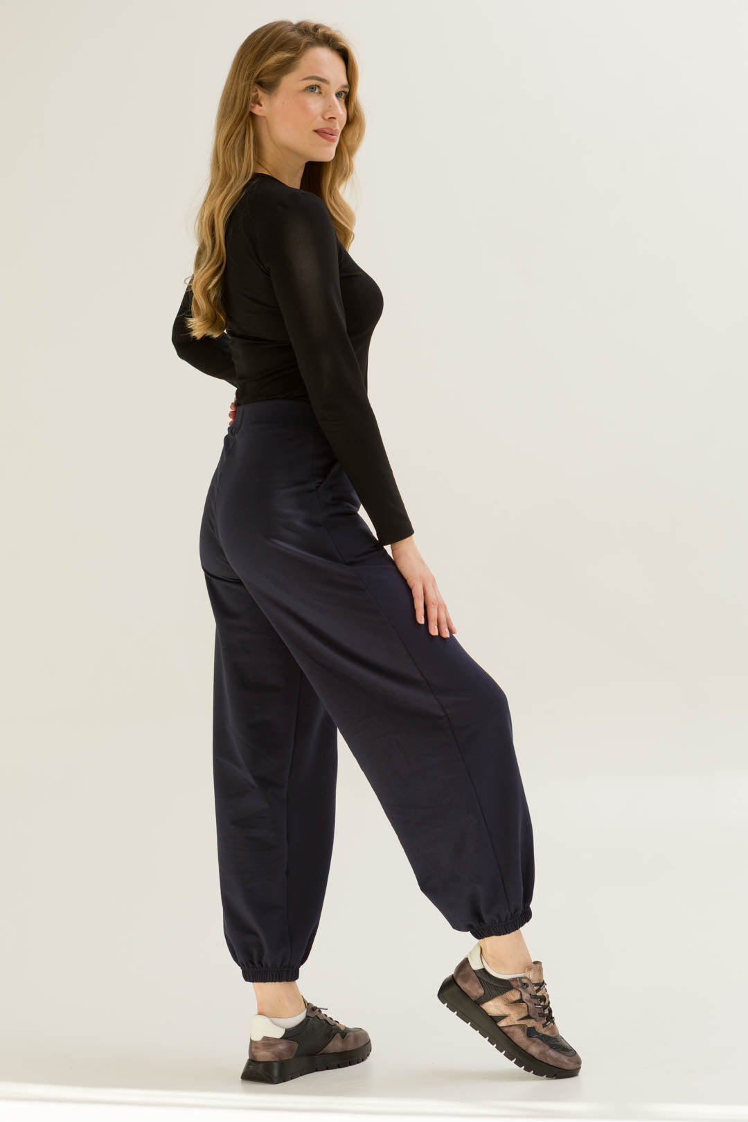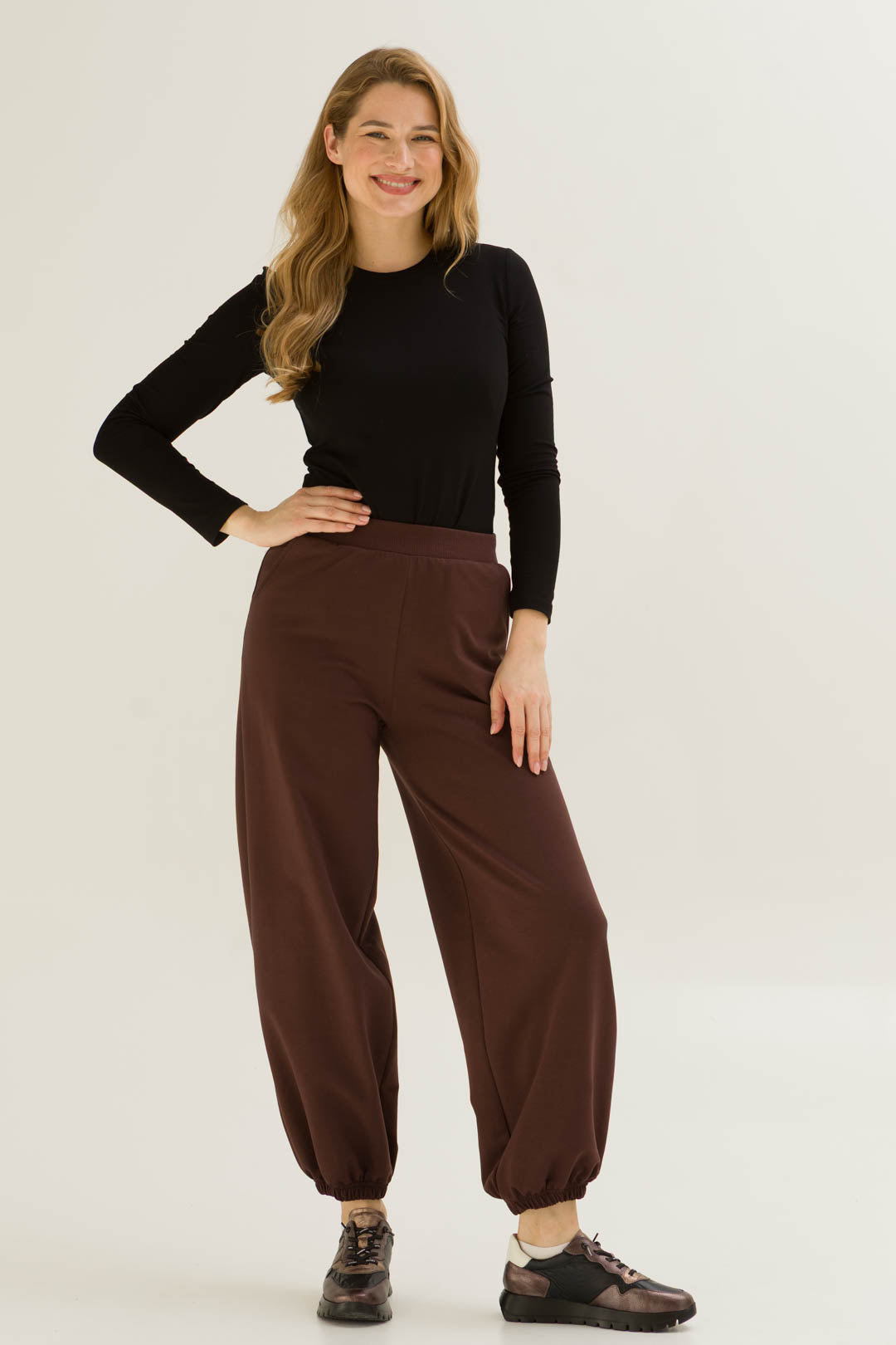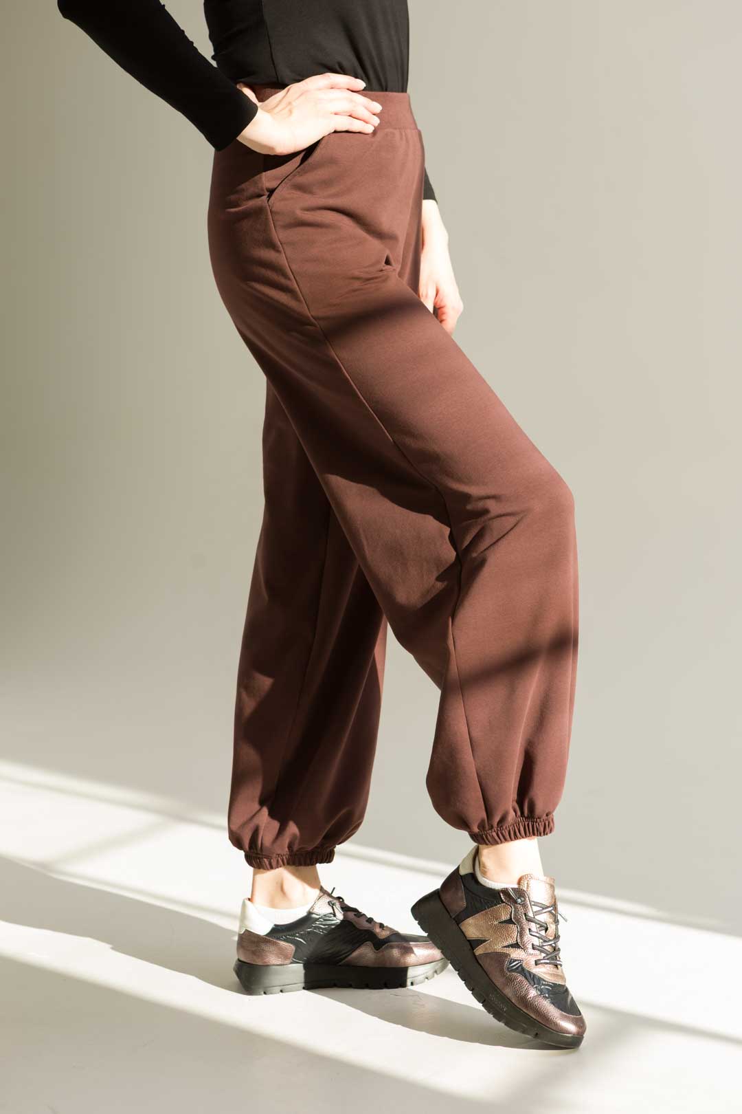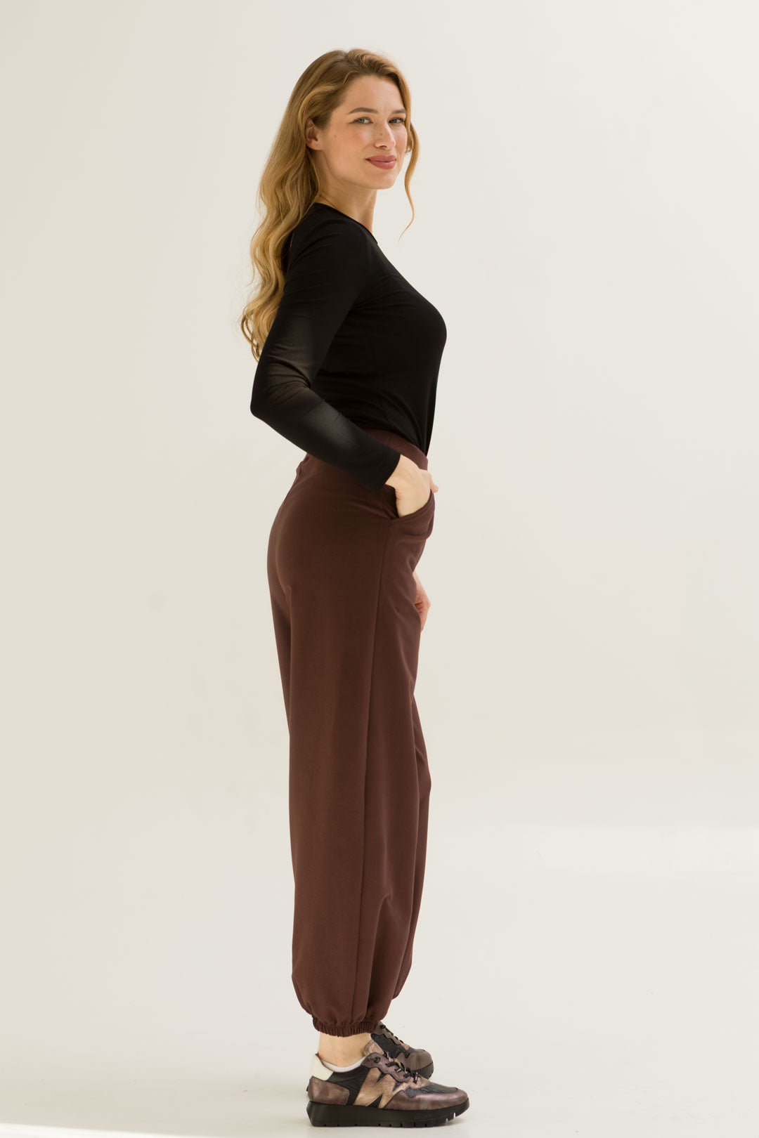 W pasie zastosowano ściągacz z prążkowanej dzianiny, pod którym ukryta jest elastyczna guma. Dzięki temu spodnie idealnie dopasowują się do figury, nie uciskając i nie zsuwając się podczas noszenia. To rozwiązanie, które gwarantuje wygodę niezależnie od sytuacji – zarówno w ruchu, jak i podczas odpoczynku.