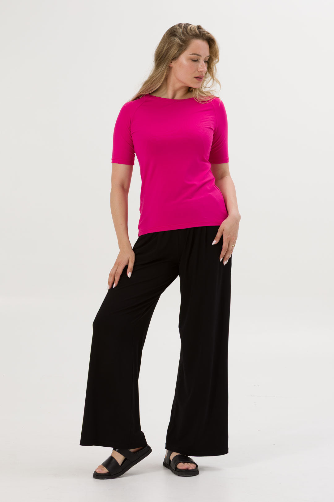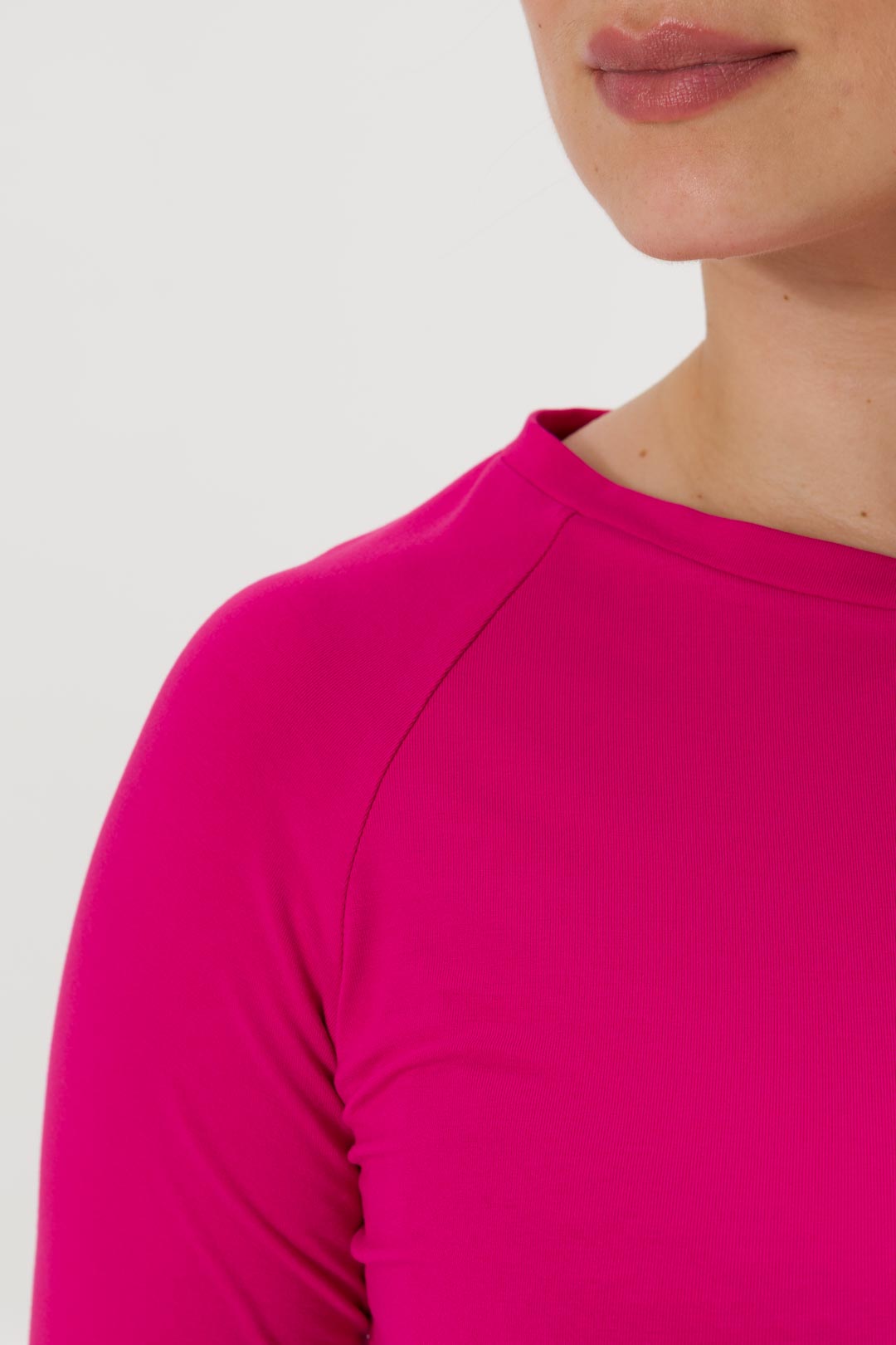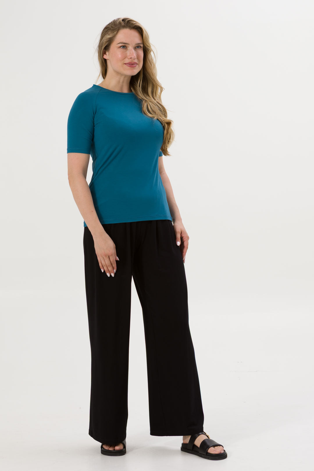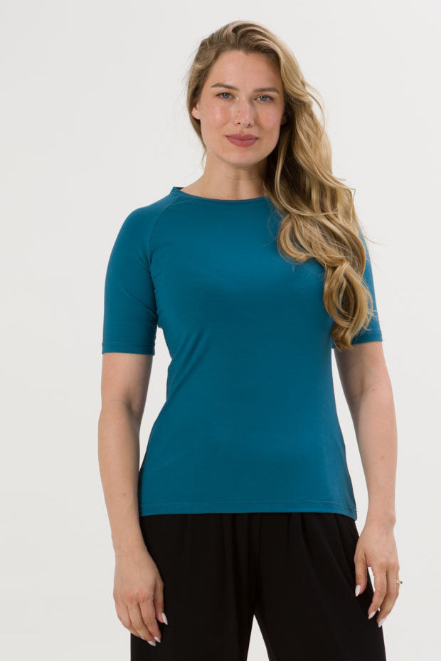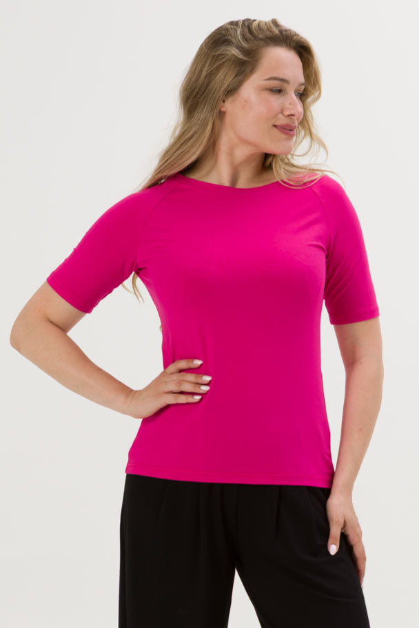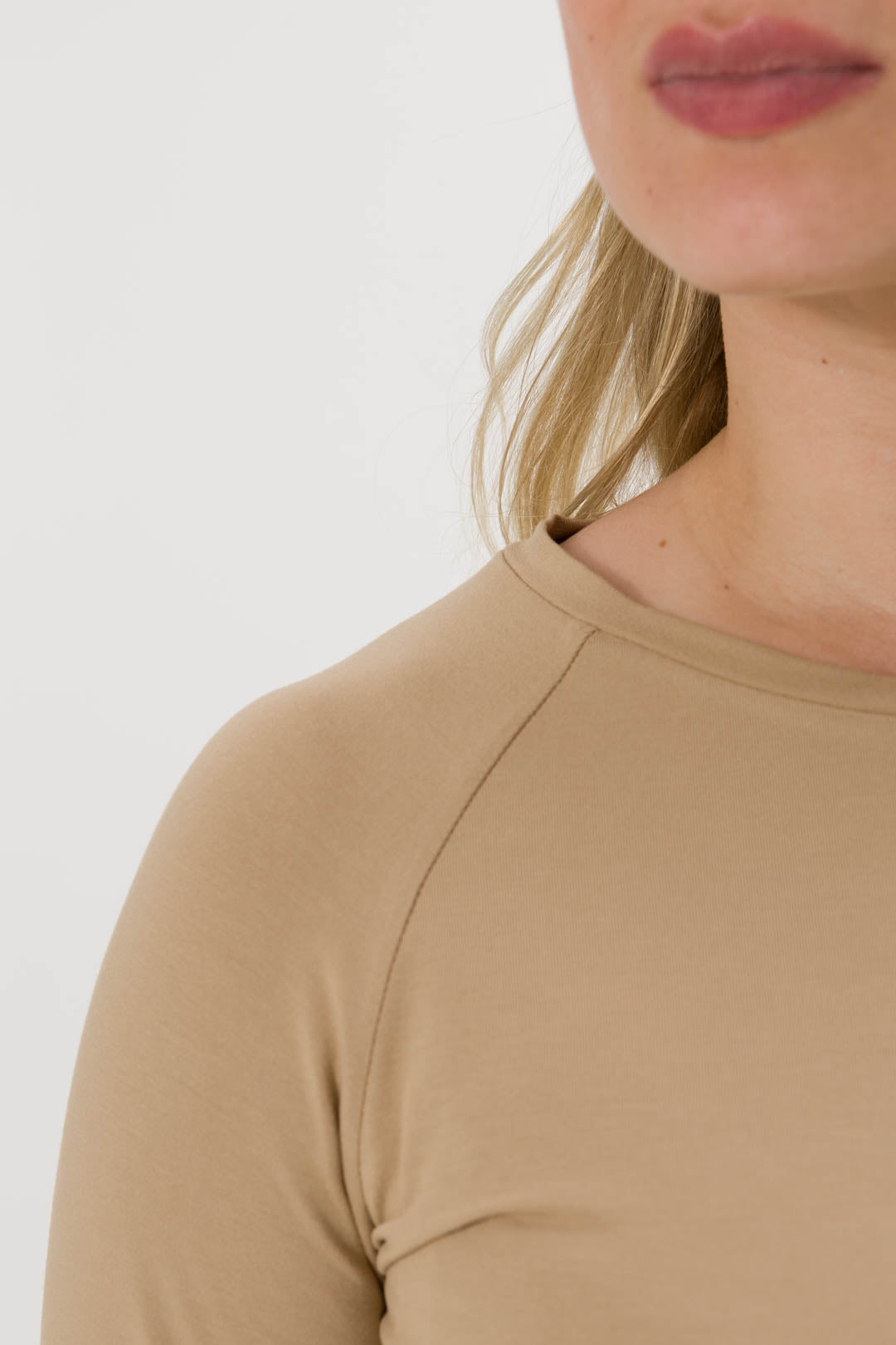Uszyta z miękkiej, przewiewnej dzianiny wiskozowej, bluzka AGNES z raglanowym rękawem do łokcia jest nie tylko przyjazna dla skóry, ale także dla środowiska. Idealnie dopasowuje się do ciała, podkreślając sylwetkę, nie ograniczając przy tym swobody ruchów.