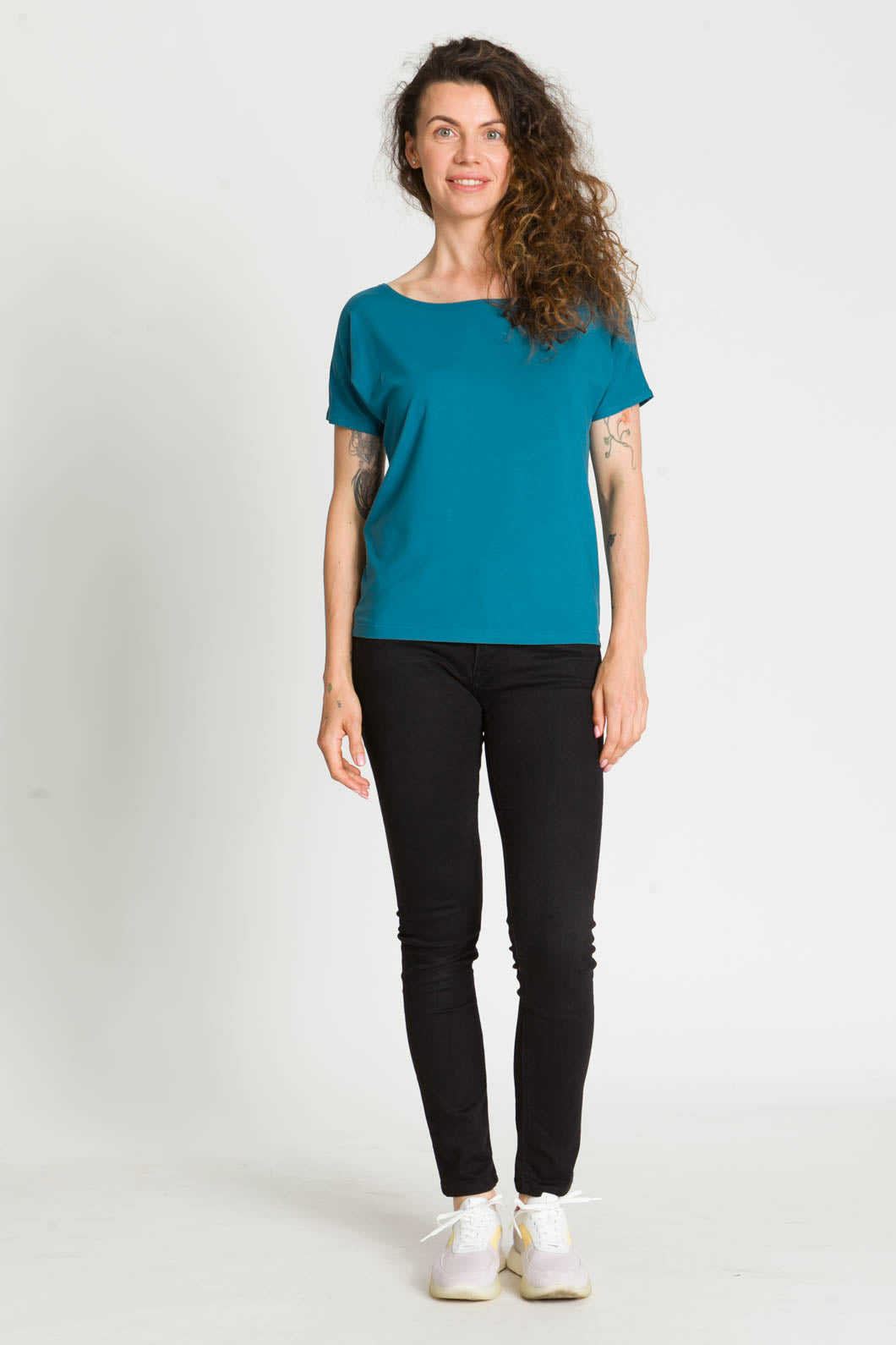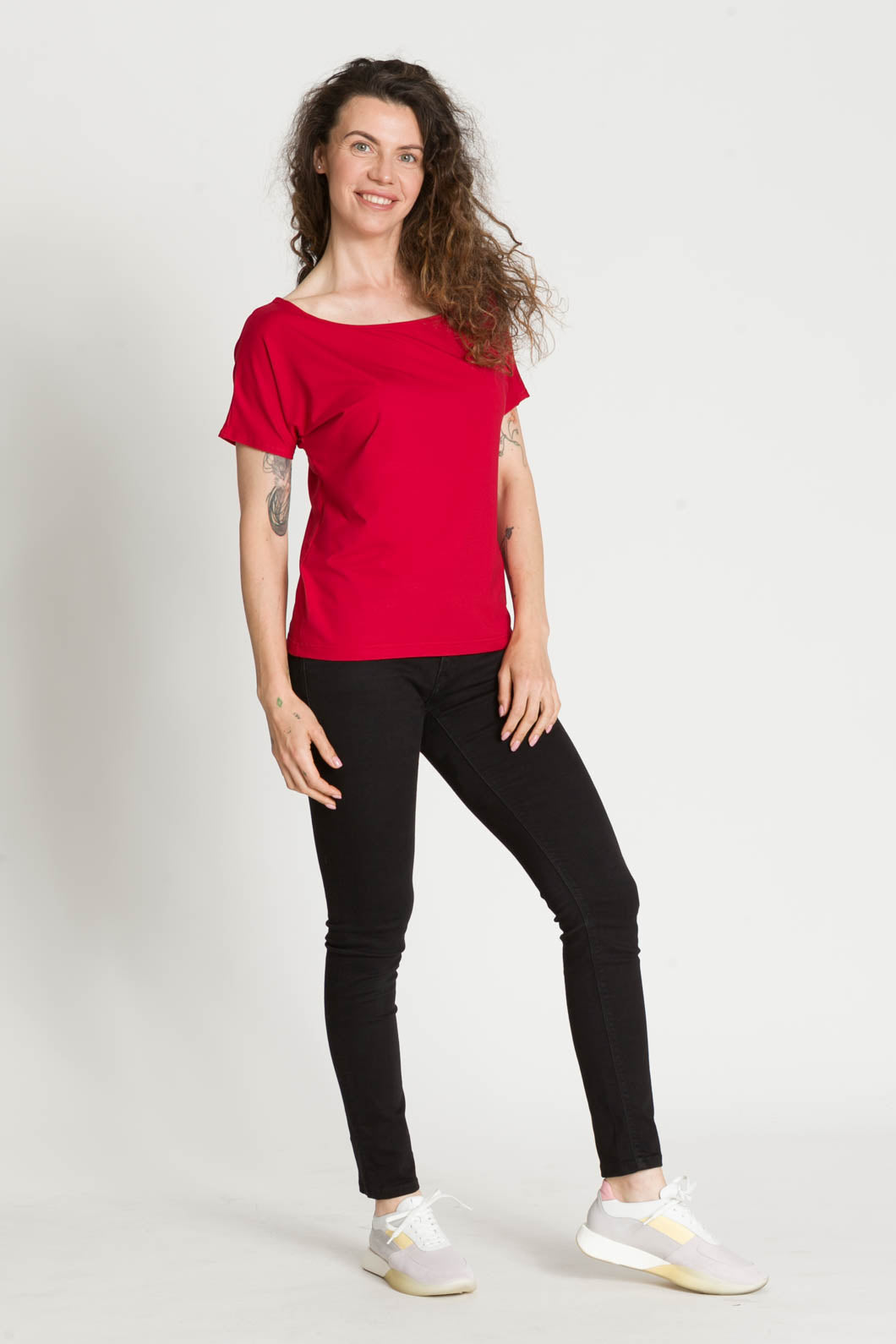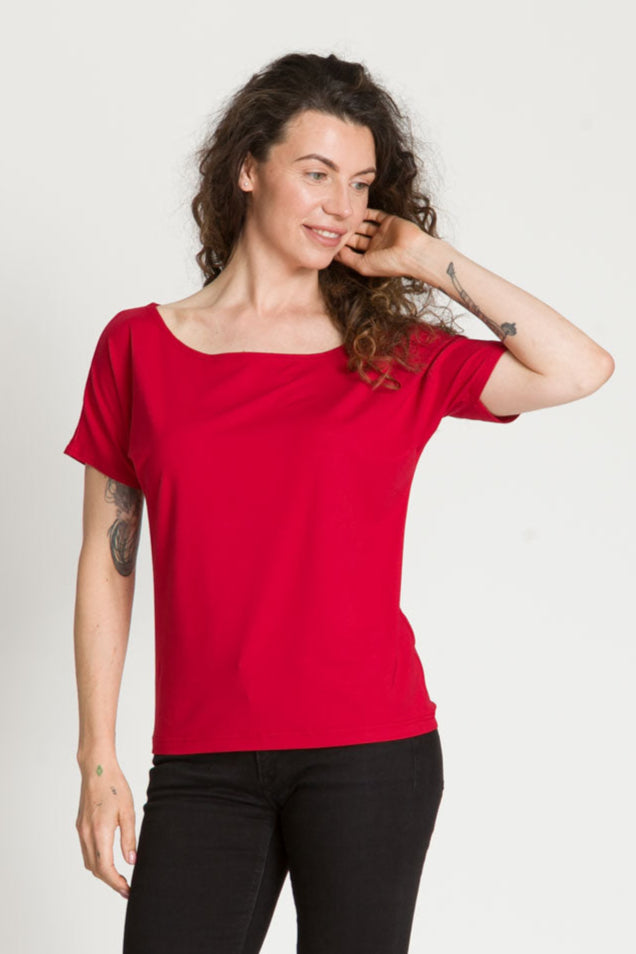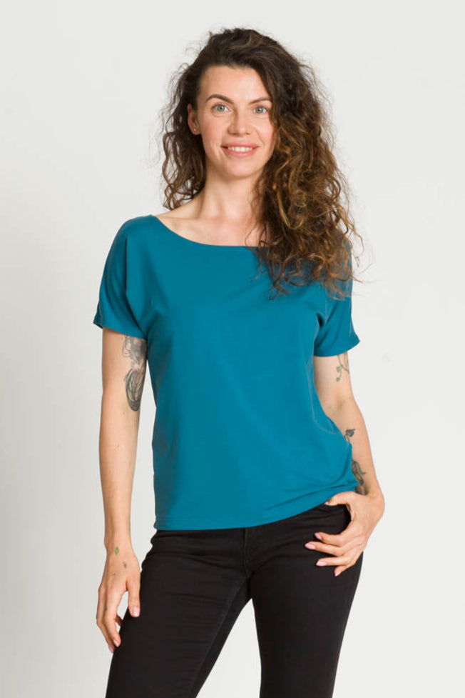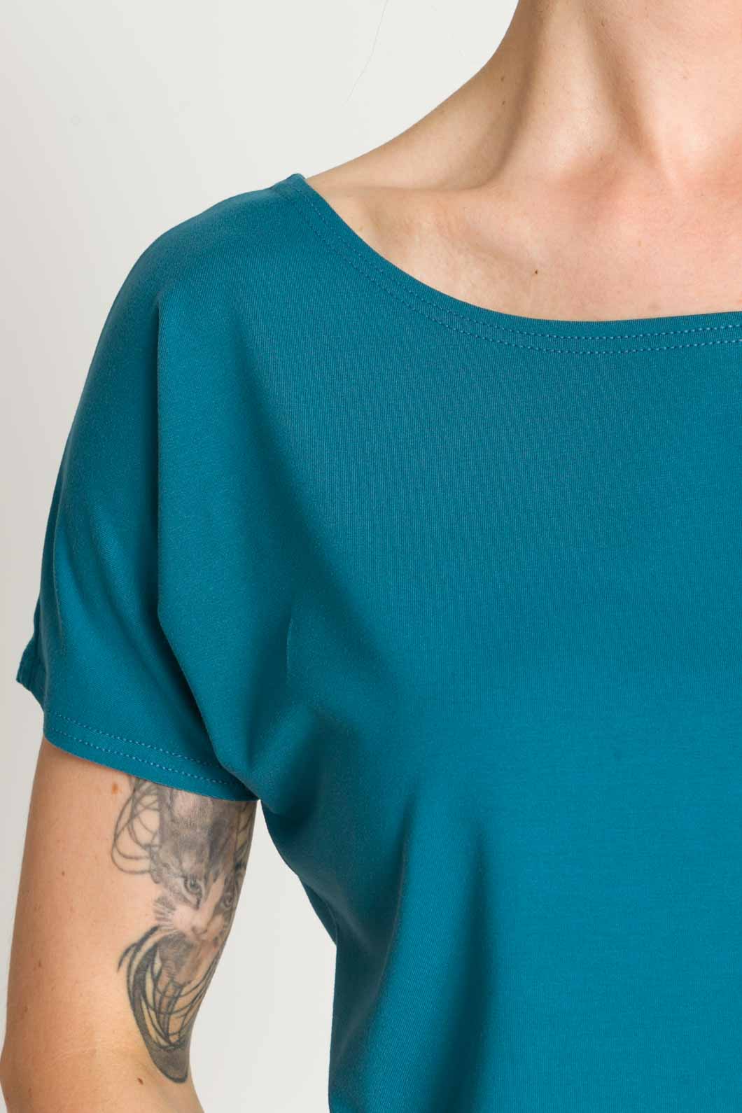 - Bluzka SARA jest uszyta na bazie Waszych ulubionych modeli - Tetyda, Brigitte, Bea. Jest luźna, dzięki czemu jest wygodna. Ma okrągły dekolt, który możesz ułożyć prosto lub lekko zsunąć na ramię i sprawić, że stylizacja nabierze mocy.