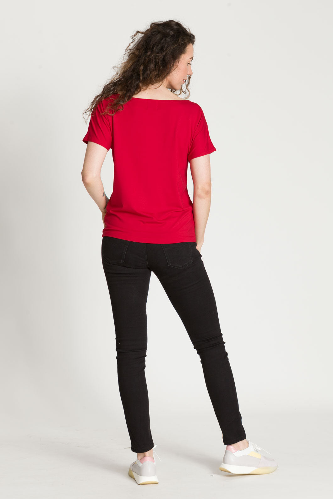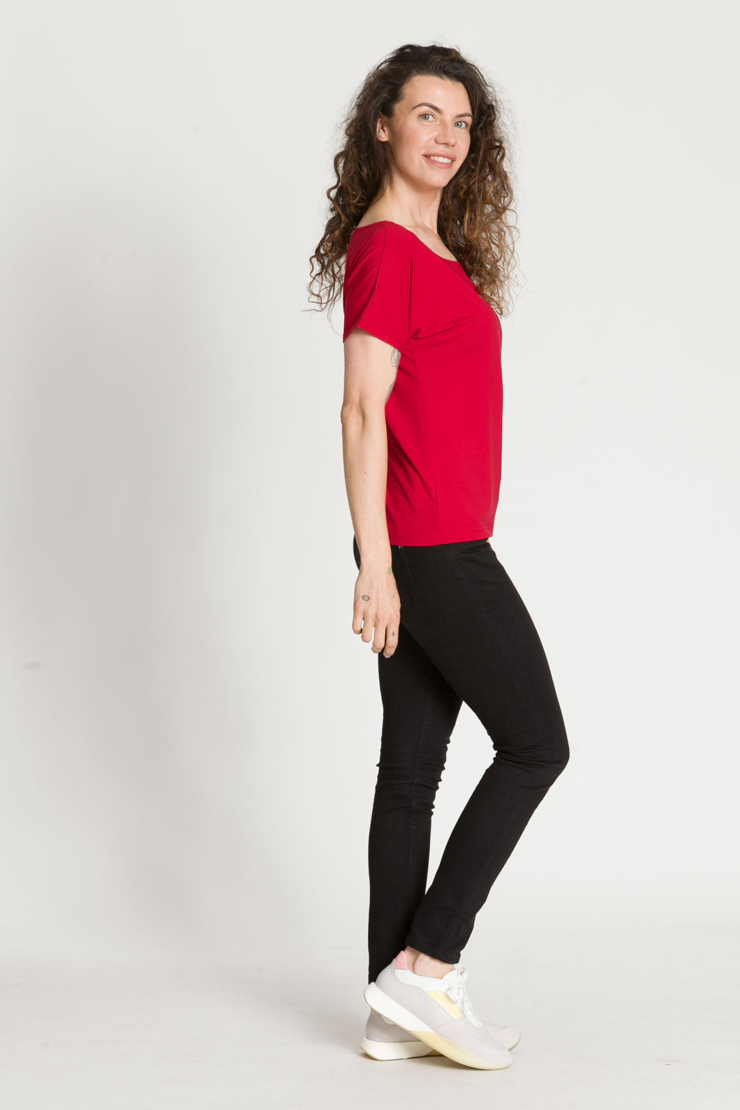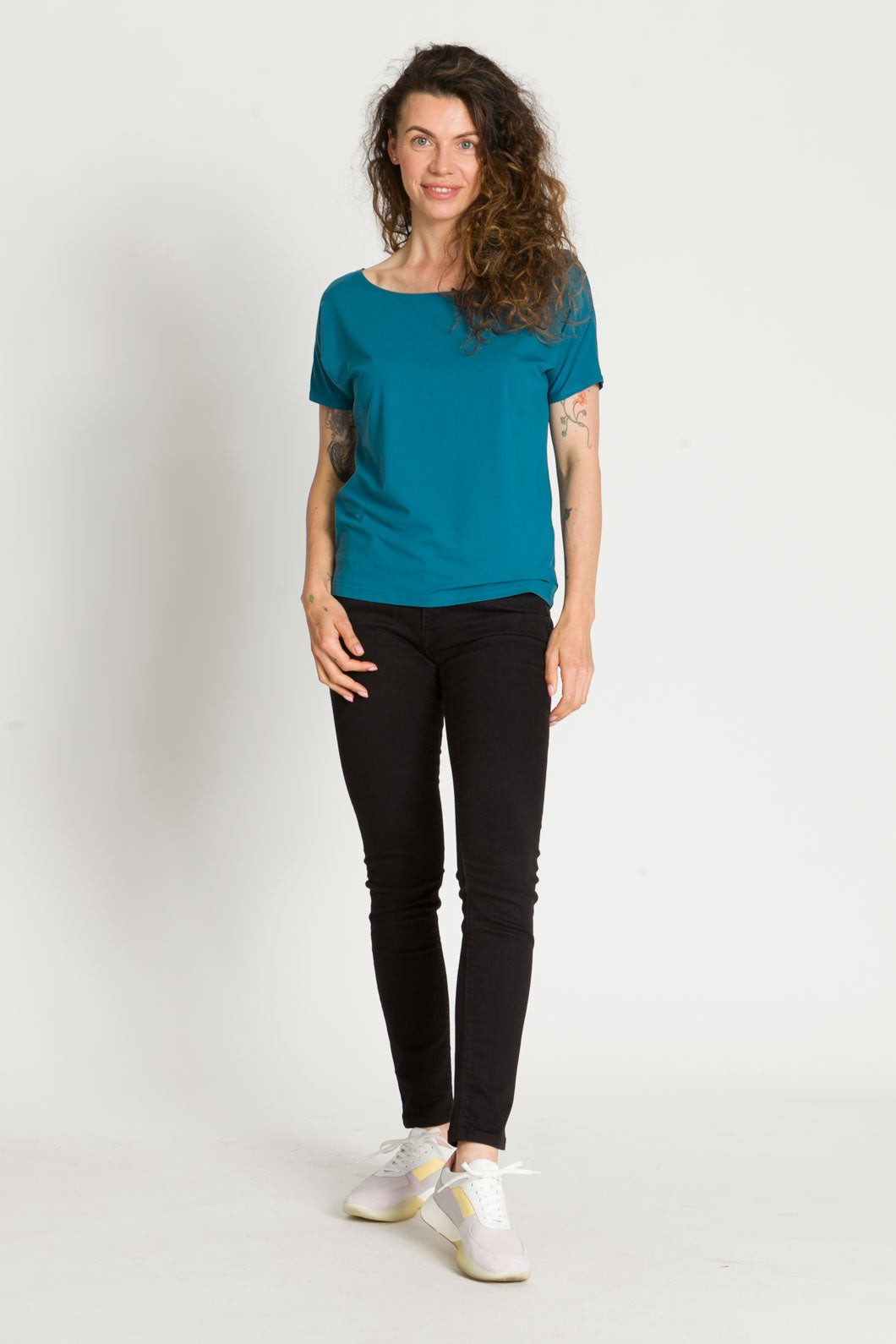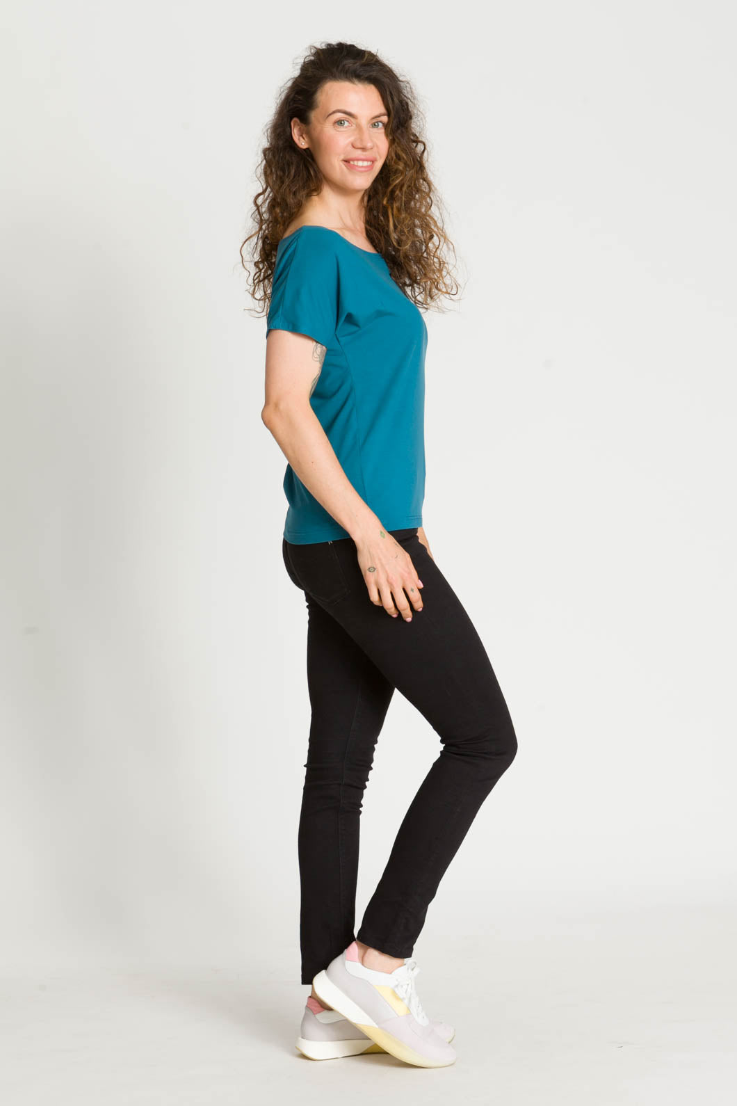 - Bluzka SARA jest uszyta na bazie Waszych ulubionych modeli - Tetyda, Brigitte, Bea. Jest luźna, dzięki czemu jest wygodna. Ma okrągły dekolt, który możesz ułożyć prosto lub lekko zsunąć na ramię i sprawić, że stylizacja nabierze mocy.