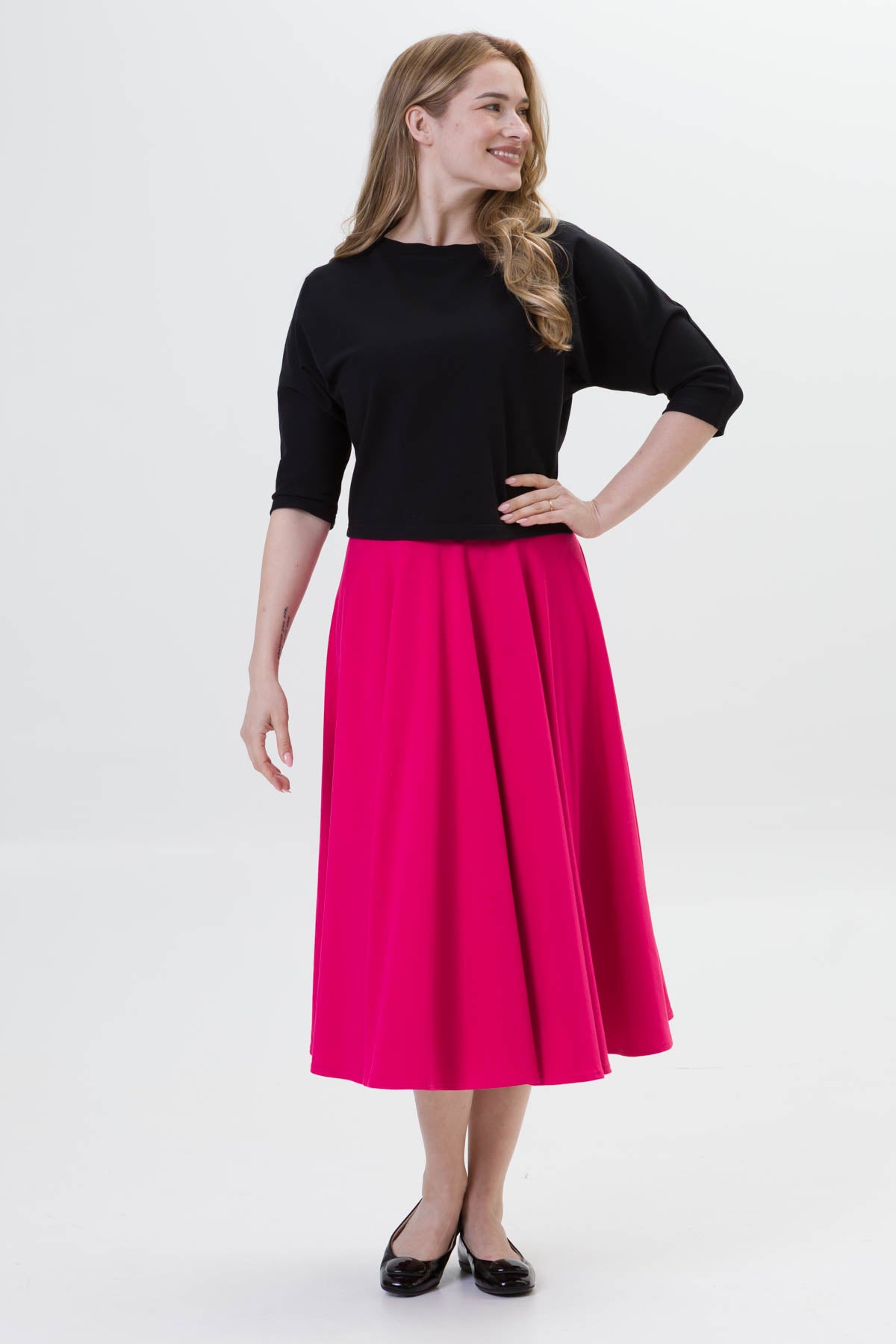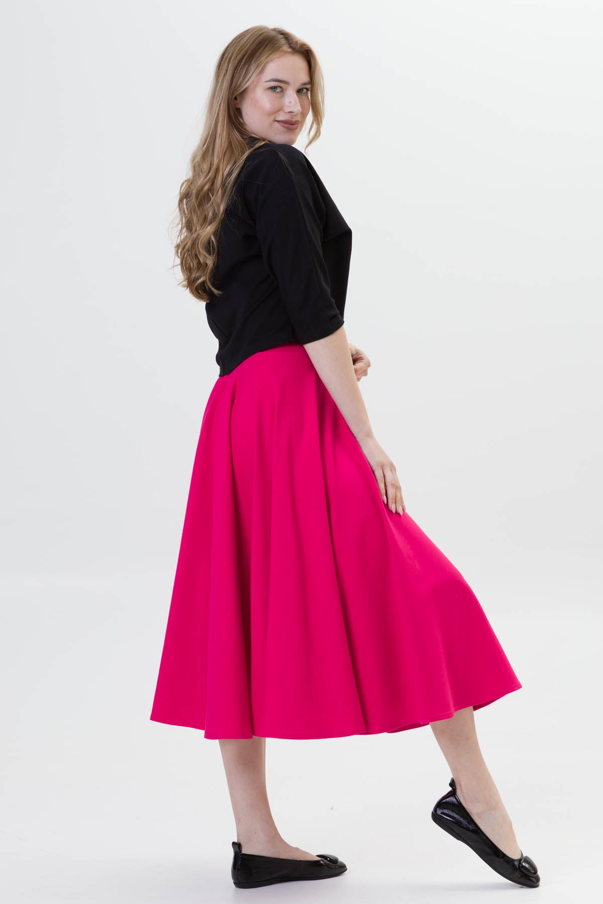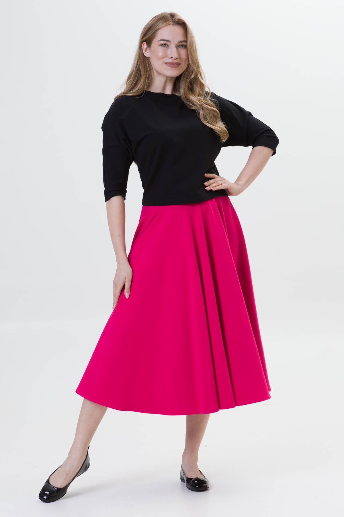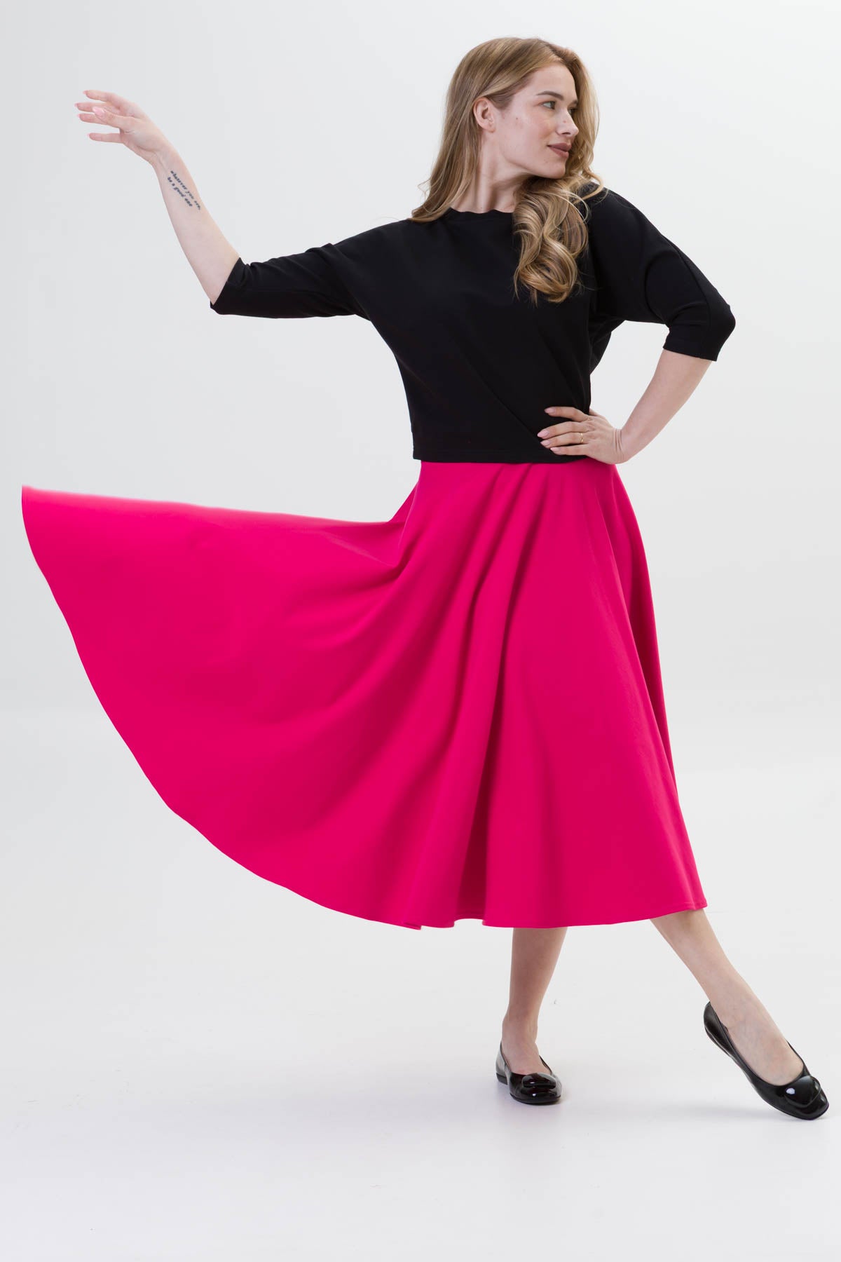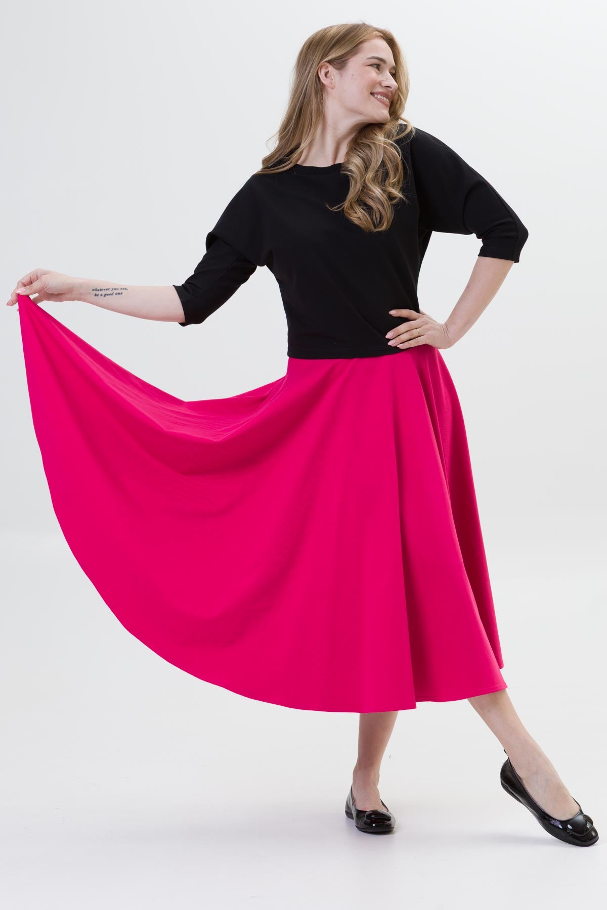 - Bez bocznych szwów, z pełnego koła, z szeroką gumą w talii. Kobiecość, ruch, swoboda — w jednym spektakularnym fasonie.