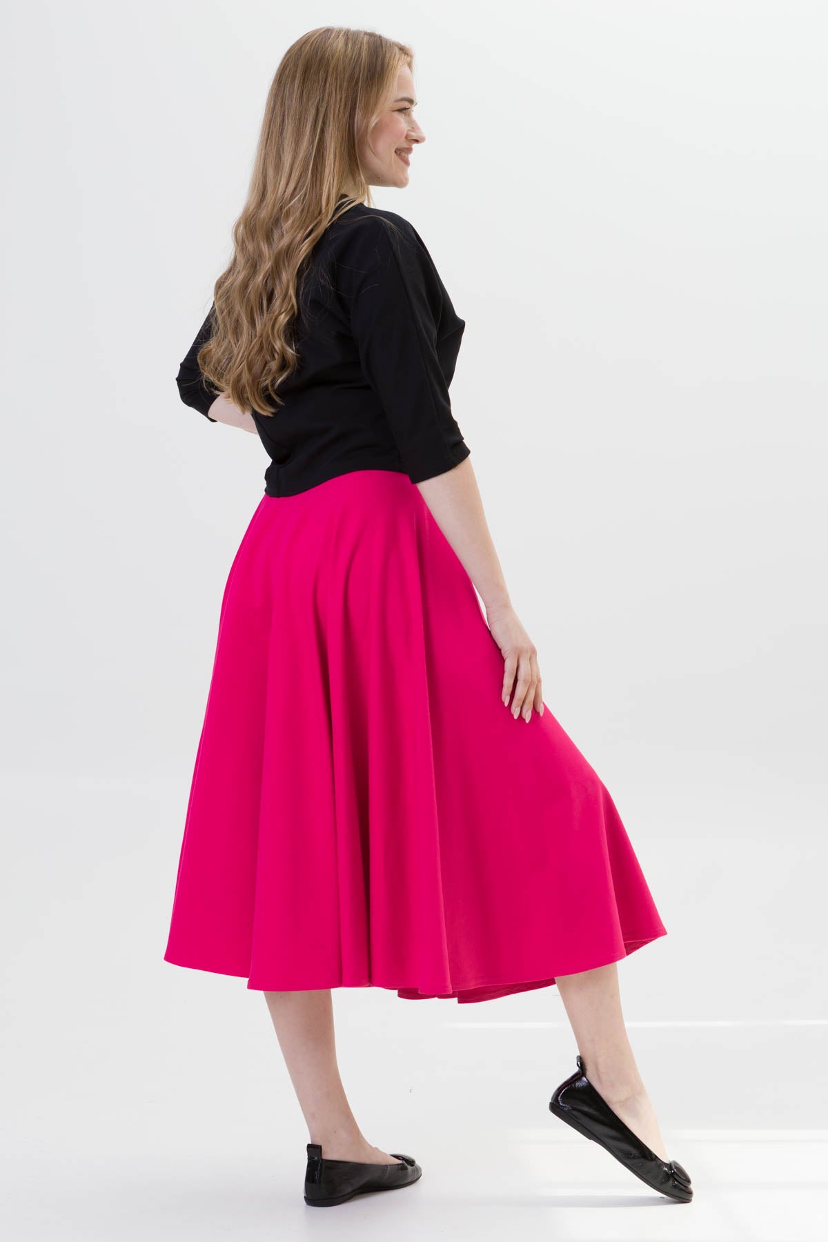 To spódnica, która nie potrzebuje dodatków, by przyciągać spojrzenia.To spódnica stworzona do ruchu.To spódnica dla Ciebie.ARIS – spódnica z charakterem i konstrukcyjną precyzjąARIS to nie tylko spódnica z pełnego koła — to projekt, który łączy klasykę z nowoczesnym podejściem do formy i materiału.Uszyta z wysokogatunkowej dzianiny bawełnianej, która od wewnątrz wykończona jest lekką, przyjemną w dotyku pętelką. Materiał nie jest gruby (gramatura 240 g), dzięki czemu pięknie się układa i nie obciąża sylwetki, ale ma też swoją tajemnicę konstrukcyjną.Dlaczego wybraliśmy dzianinę z pętelką?Bo ta struktura stabilizuje włókna, co ma ogromne znaczenie przy kroju z pełnego koła. W spódnicach tego typu nie da się zachować prostej nitki na całym obwodzie — kiedy przód układa się idealnie, boki mogą „pracować” inaczej.Pętelka to gwarancja, że koło zawsze pozostanie kołem — bez nieestetycznego rozciągania czy tracenia kształtu.Efekt?Spódnica, która nie tylko wygląda spektakularnie, ale też zachowuje swój fason przez długi czas. Miękka, kobieca, ale z konstrukcyjną siłą.