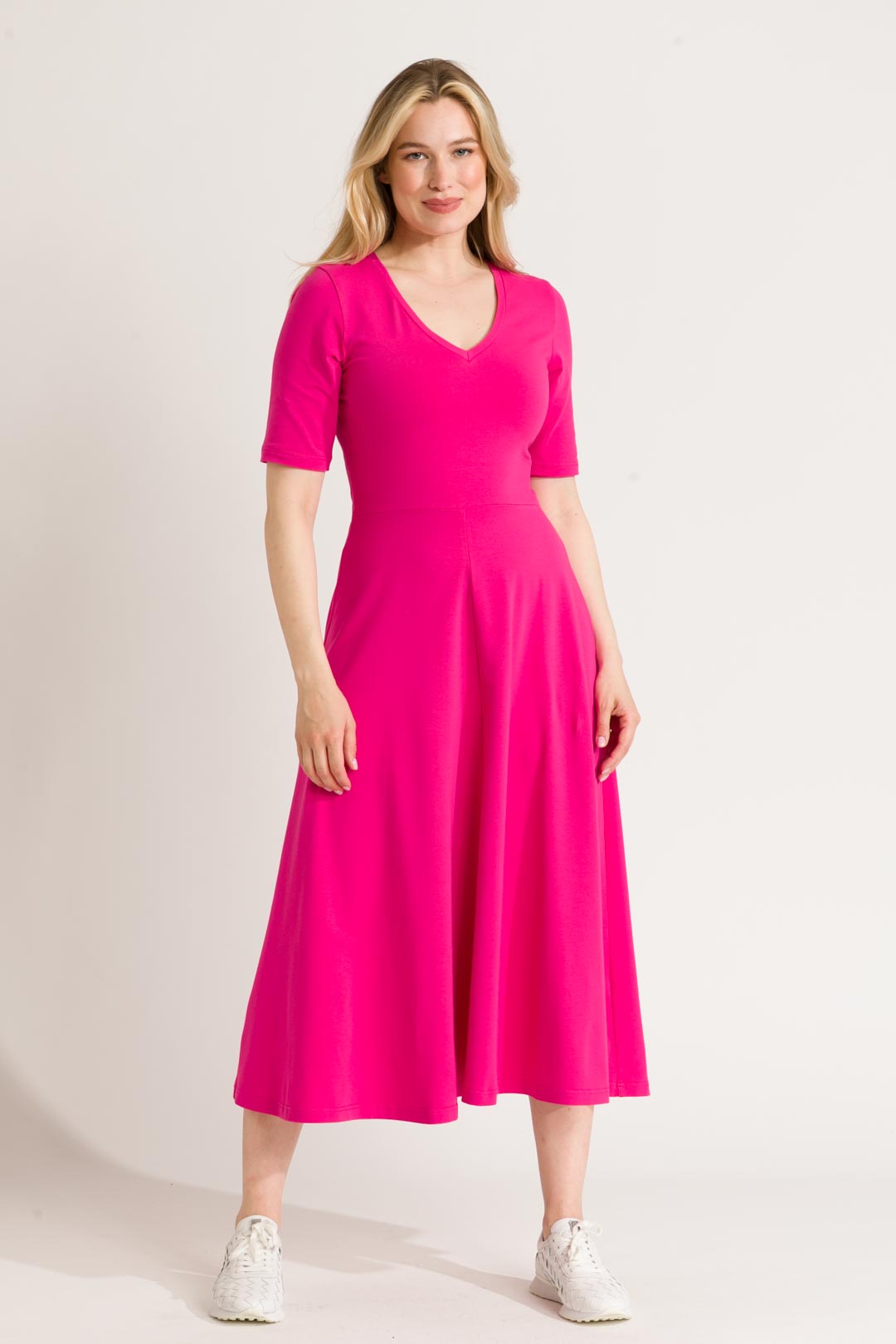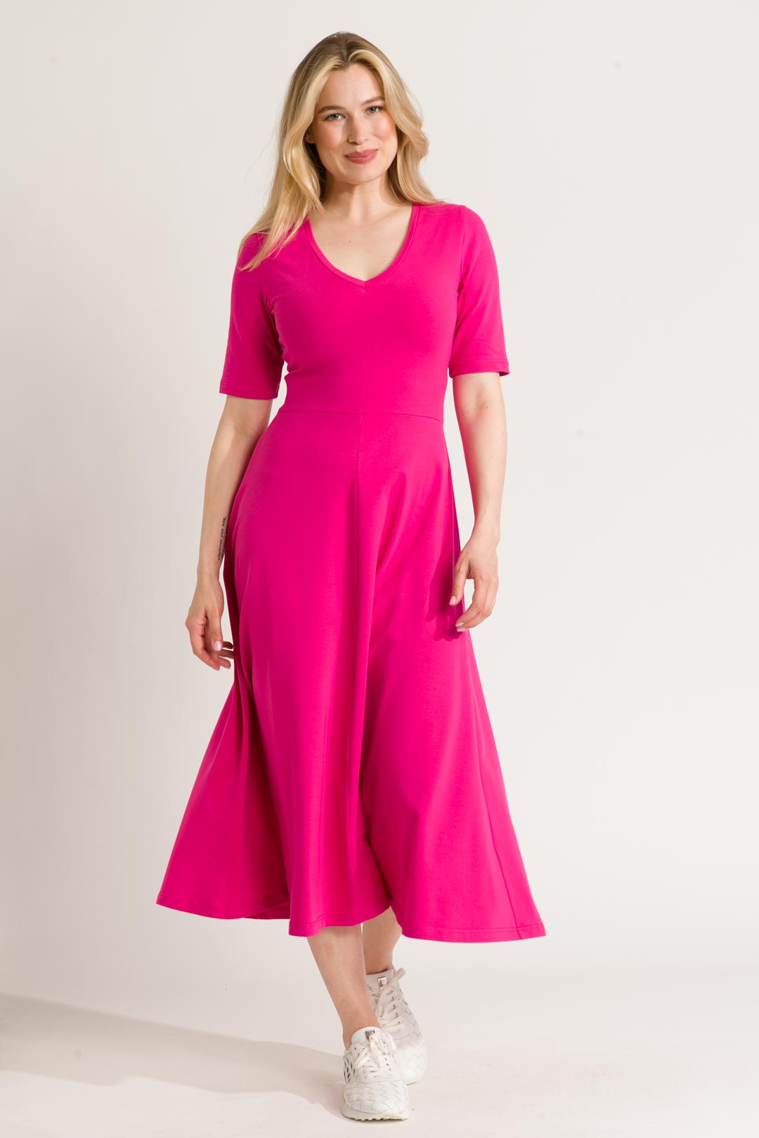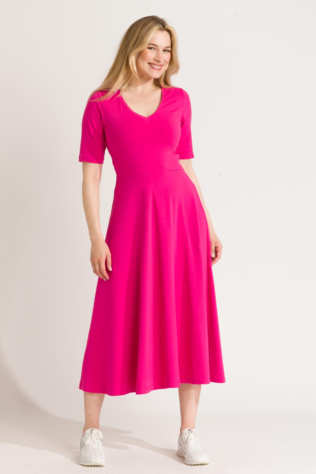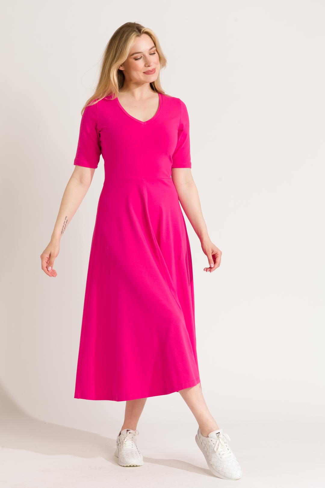Capri ma rozkloszowany dół, który składa się z 4 klinów. Dekolt jest wykończony pliską w kolorze dzianiny, a rękaw główkowy o długości bardzo kobiecej i eleganckiej. W talii jest pięknie wymodelowana, co nadaje jej stylu.
