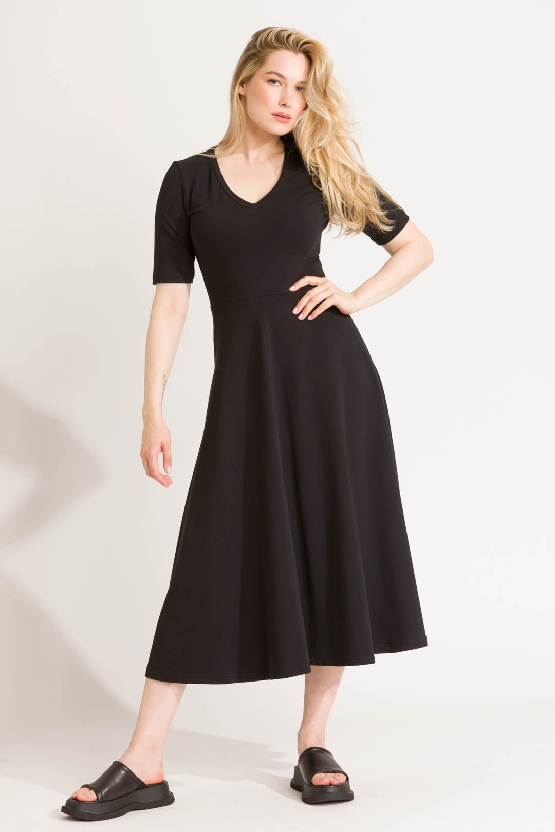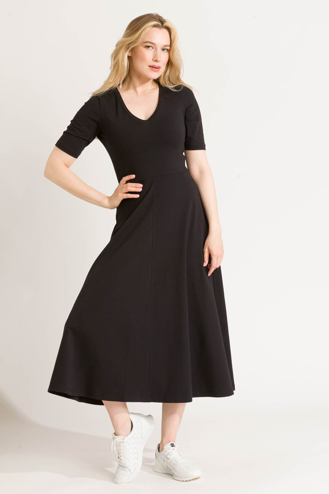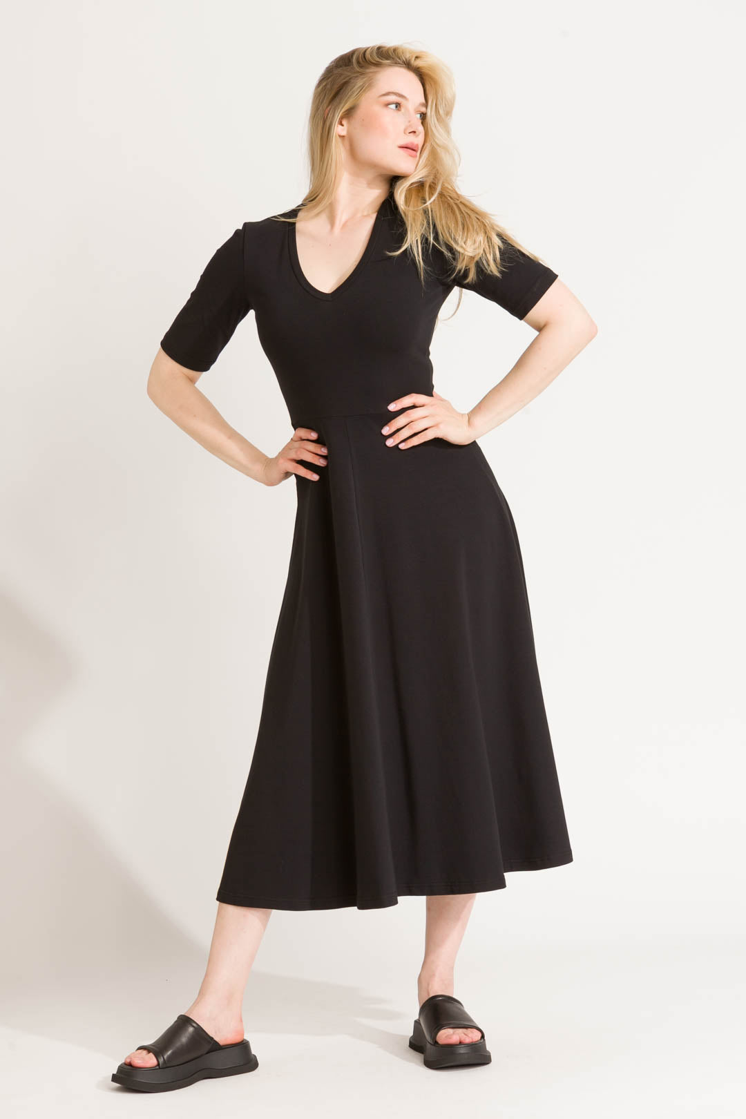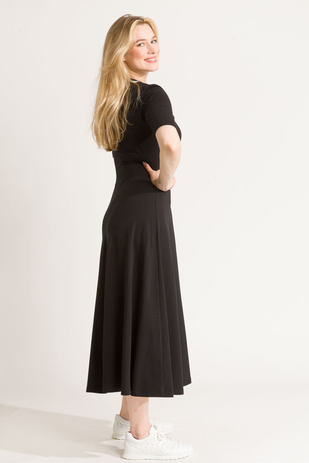 Capri ma rozkloszowany dół, który składa się z 4 klinów. Dekolt jest wykończony pliską w kolorze dzianiny, a rękaw główkowy o długości bardzo kobiecej i eleganckiej. W talii jest pięknie wymodelowana, co nadaje jej stylu.