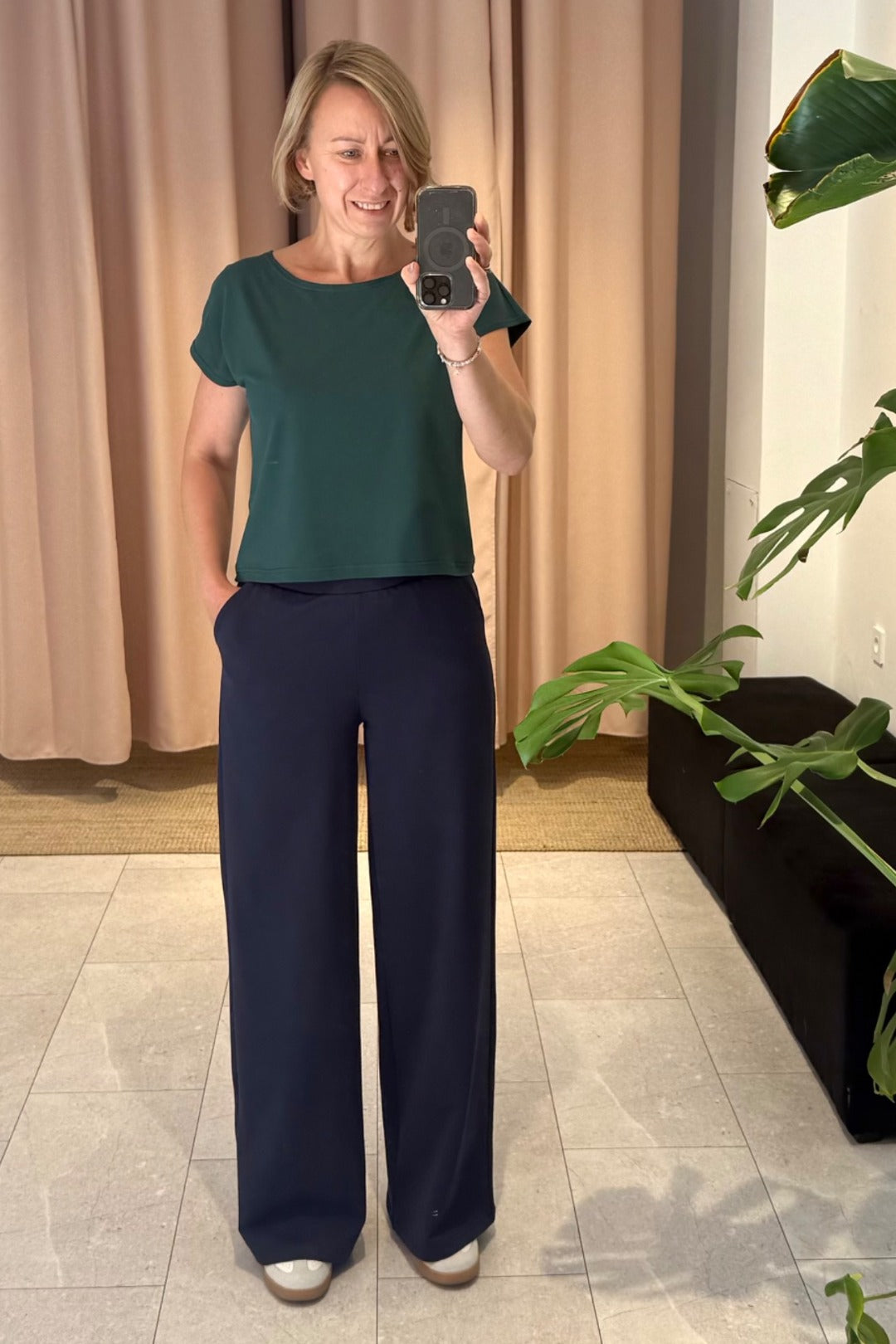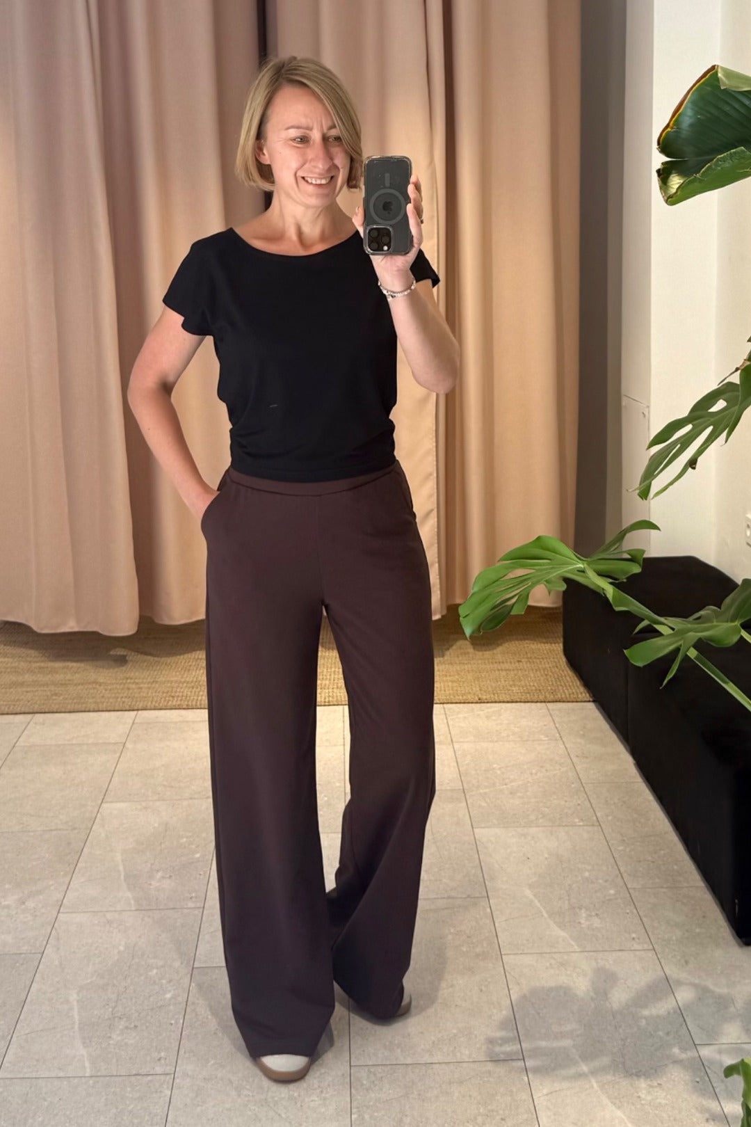 - Proste, długie nogawki - optycznie wydłużają sylwetkę i dodają elegancji.
