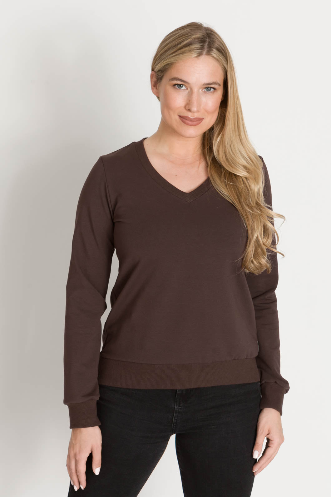 - Uszyliśmy ją z przyjemnej w noszeniu i delikatnej w dotyku dzianiny bawełnianej, która sprawi radość Twojej skórze. Bluza z dekoltem V to stylizacyjna baza w Twojej szafie.