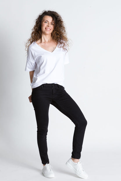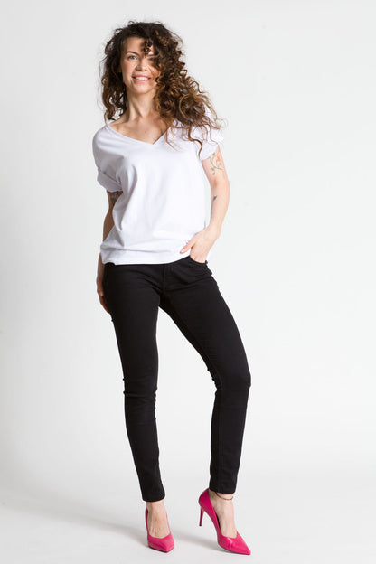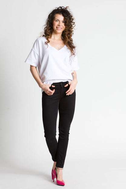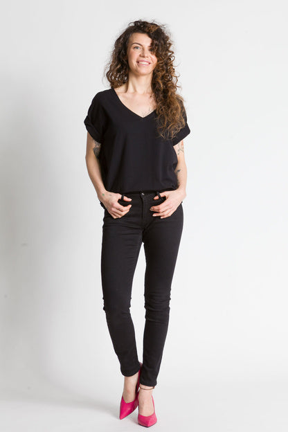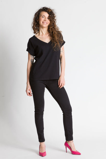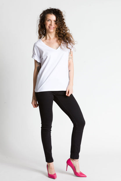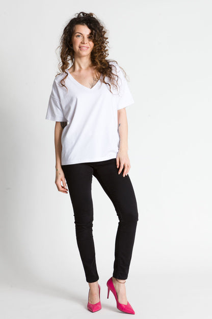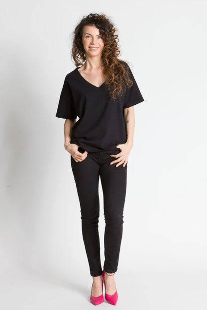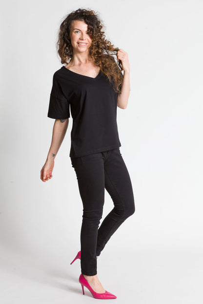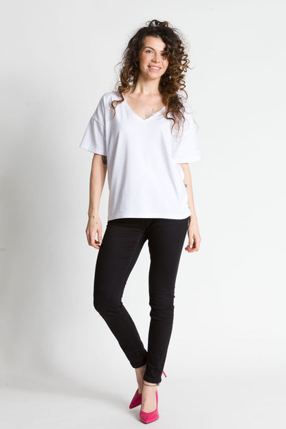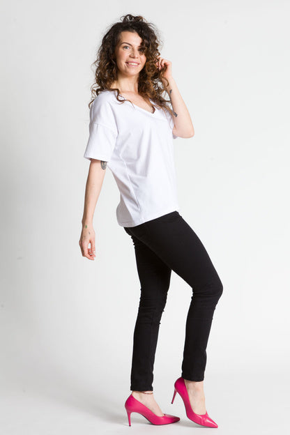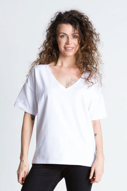 - Luźna bluzka z głębszym dekoltem w kształcie litery V wykonana z bawełny jest świetnym wyborem na wiele okazji. Taka bluzka jest zarówno stylowa, jak i wygodna, idealna na letnie dni lub na spotkania ze znajomymi.