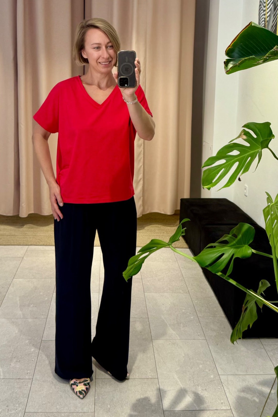 Bluzka DELIA – kobieca, bawełniana bluzka z dekoltem V i luźnym fasonem.Poznaj bluzkę DELIA – najnowszy projekt oparty na naszym bestsellerowym modelu ODELIA. To propozycja dla kobiet, które szukają połączenia wygody, kobiecego stylu i ponadczasowego kroju. Bluzka została uszyta z wysokiej jakości bawełny, która jest przyjemna w dotyku, oddychająca i delikatna dla skóry.Luźny fason zapewnia pełną swobodę ruchów i świetnie sprawdza się w codziennych stylizacjach. Krótkie rękawy i subtelny dekolt w serek (V-neck) dodają bluzce lekkości i kobiecego uroku. To idealna opcja zarówno do jeansów, spodni materiałowych, jak i spódnic – świetnie wygląda w wersji na luzie, jak i z dodatkami w stylu smart casual.Bluzka DELIA to nie tylko modny wygląd, ale także funkcjonalność. Doskonale sprawdzi się w sezonie wiosna–lato, ale dzięki uniwersalnemu krojowi możesz nosić ją przez cały rok – wystarczy dobrać odpowiednie dodatki.Najważniejsze cechy: