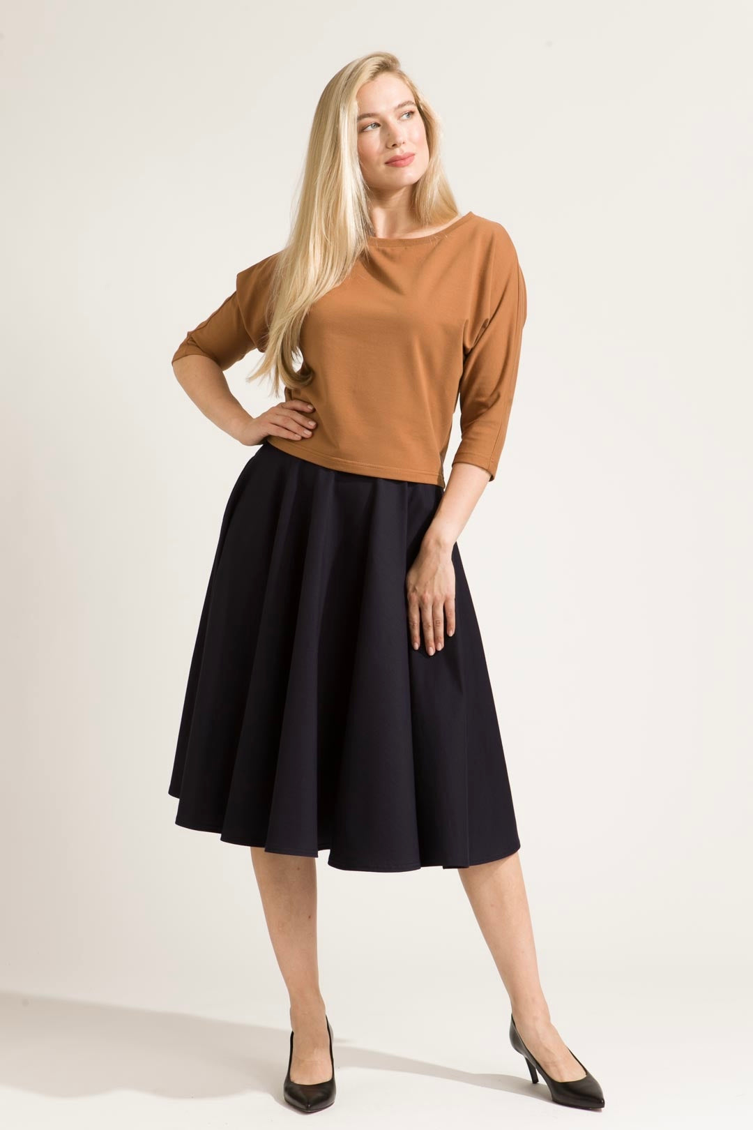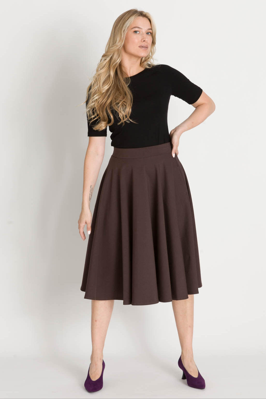 - To klasyczna spódnica z pełnego koła, sięgająca za kolano – nieodzowny element garderoby każdej kobiety ceniącej styl i funkcjonalność. Dzięki temu modelowi zawsze znajdziesz idealną stylizację na każdą okazję.
