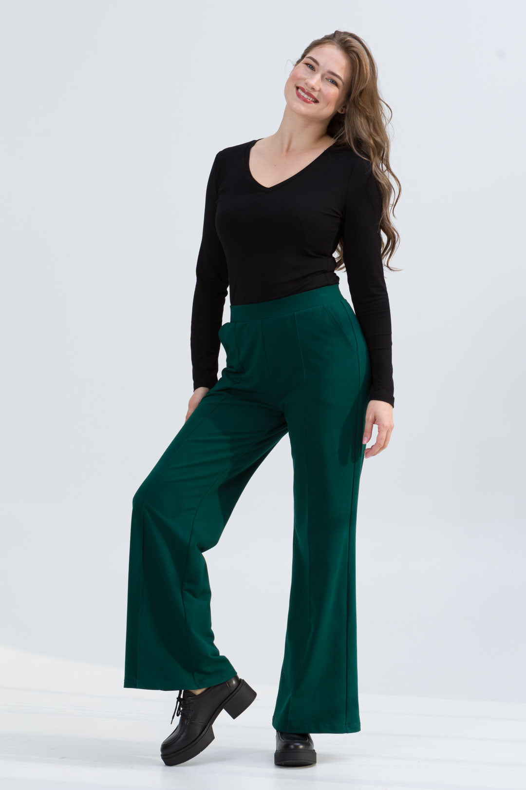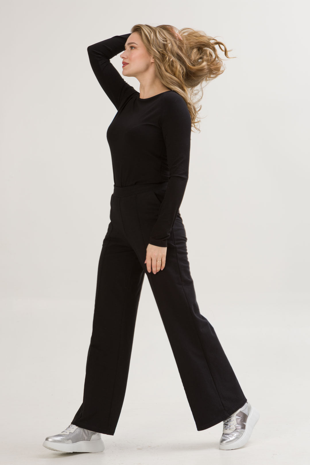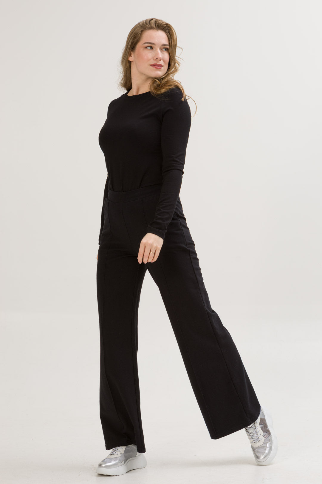 • SIENA to eleganckie spodnie o szerokiej nogawce i dopasowanej górze i wysokiej jakości dzianinie, co zapewnia komfort i styl na co dzień. Dzięki przeszyciom przypominającym kant na przedniej części nogawki, spodnie zyskują klasyczny wygląd.