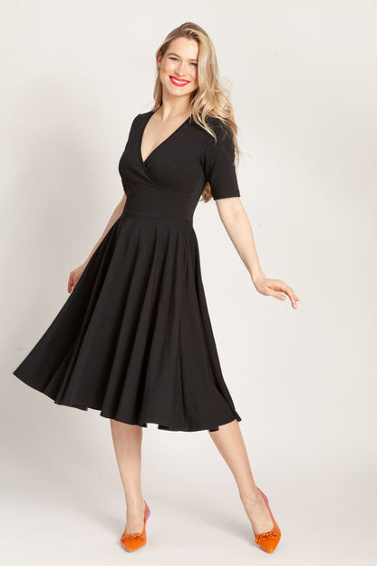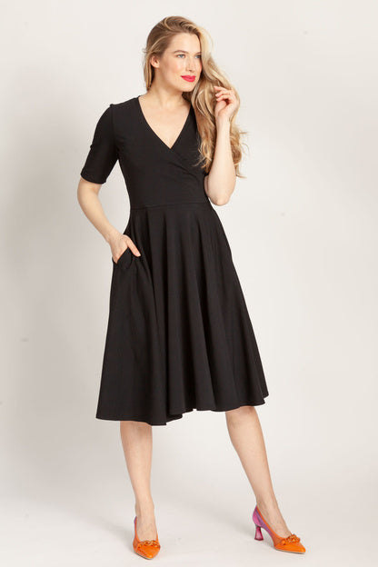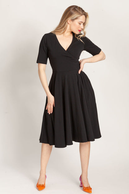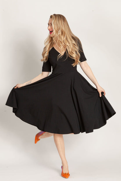 - Sukienka z koła z dekoltem V to esencja kobiecości zamknięta w miękkiej dzianinowej formie. W szwach bocznych ukryliśmy kieszenie, dekolt wykończyliśmy plisą, dzięki czemu się nie otwiera. Jest to bardzo korzystny dla figury krój.