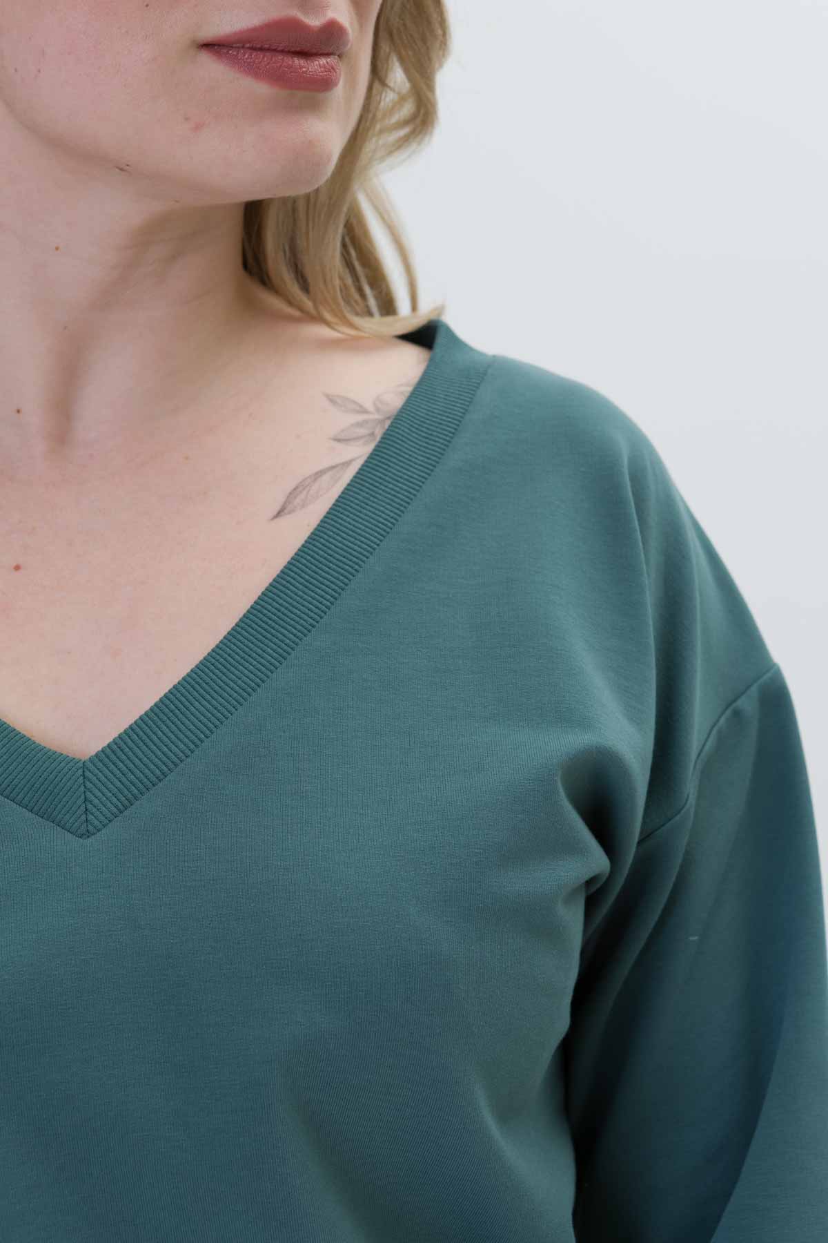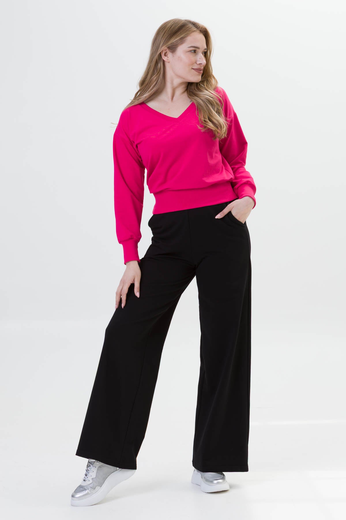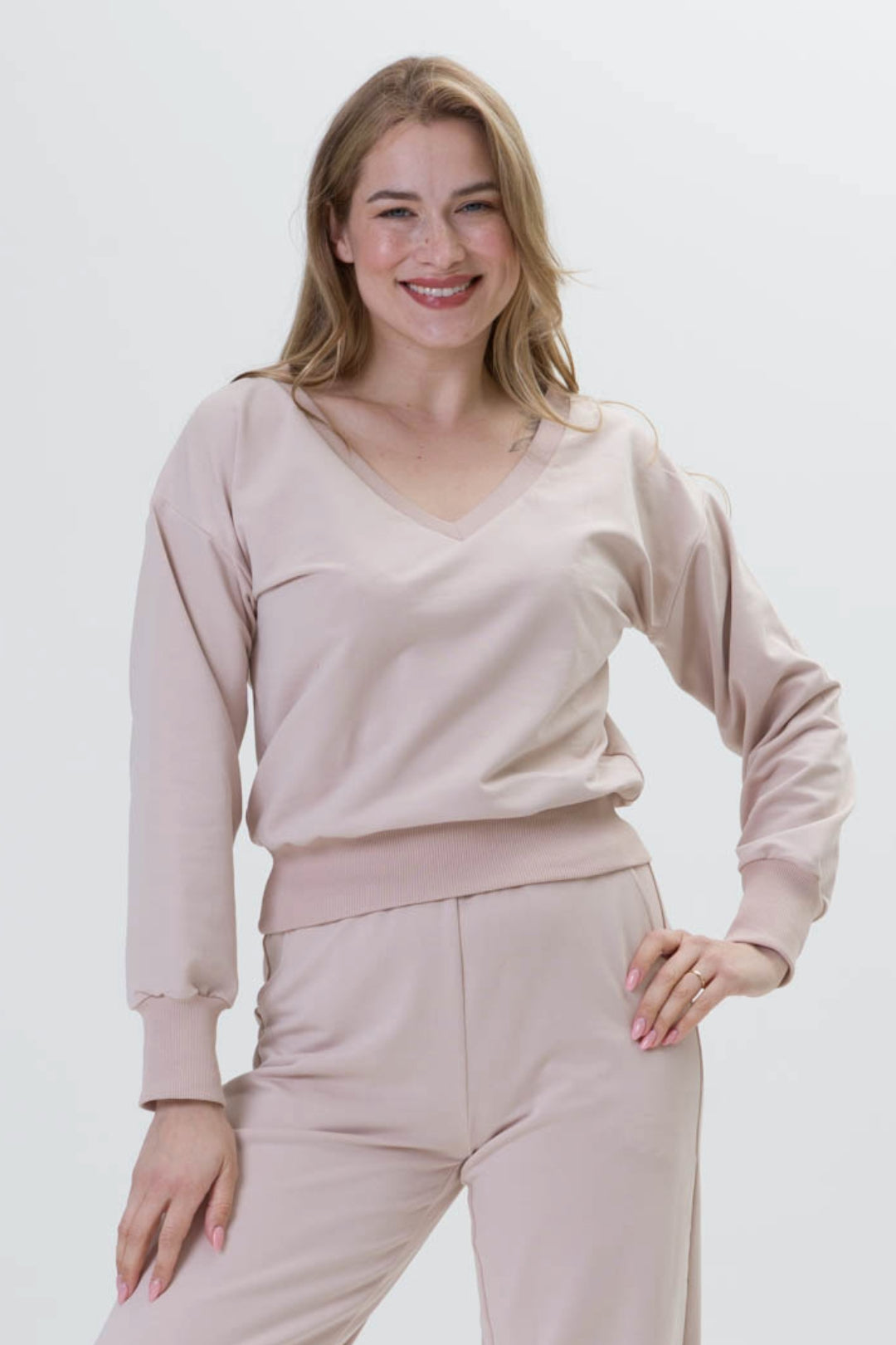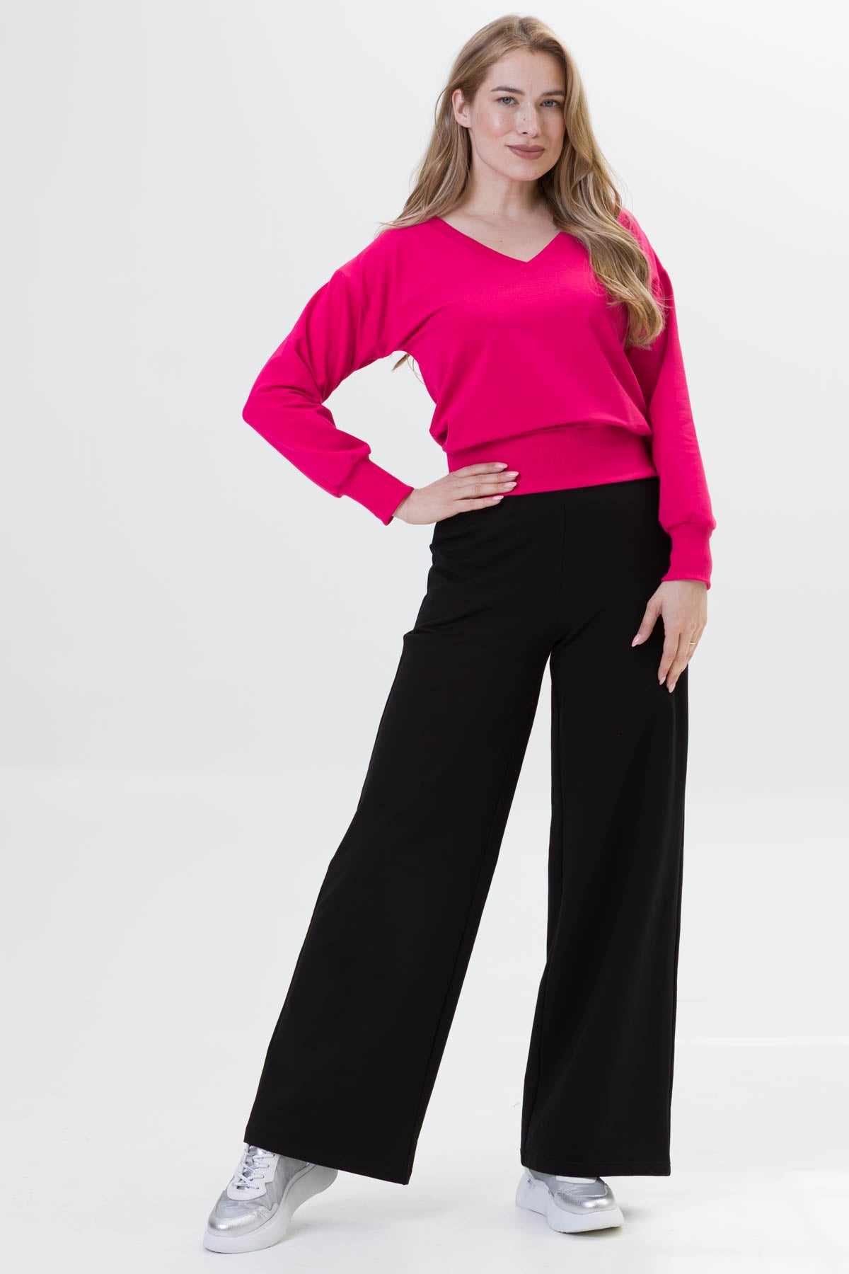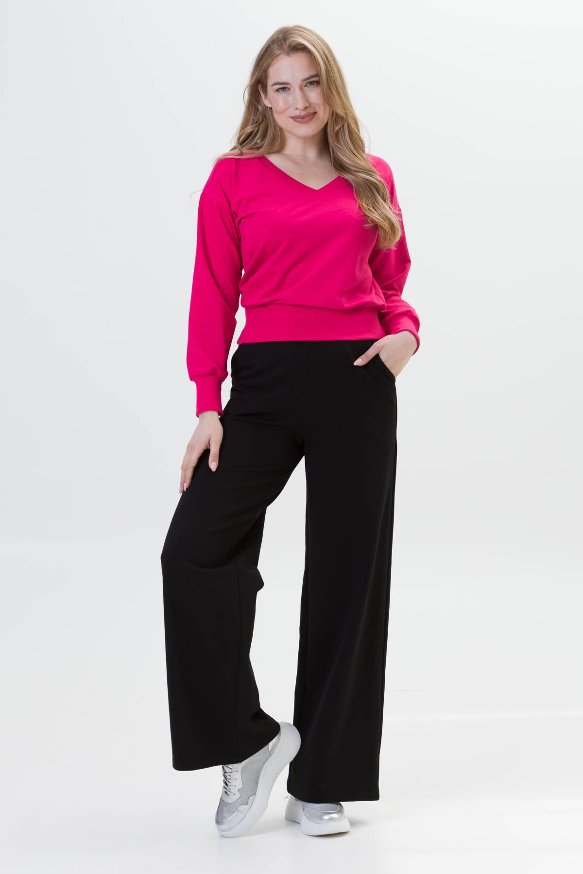 Dekolt w kształcie litery V optycznie wydłuża szyję i dodaje lekkości całej stylizacji, a elastyczne ściągacze przy rękawach, dekolcie i na dole bluzy nadają całości wyrazistego charakteru.