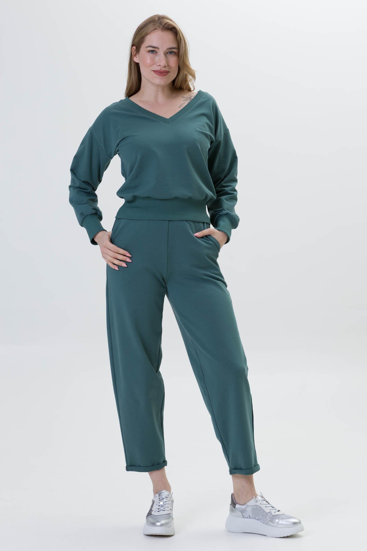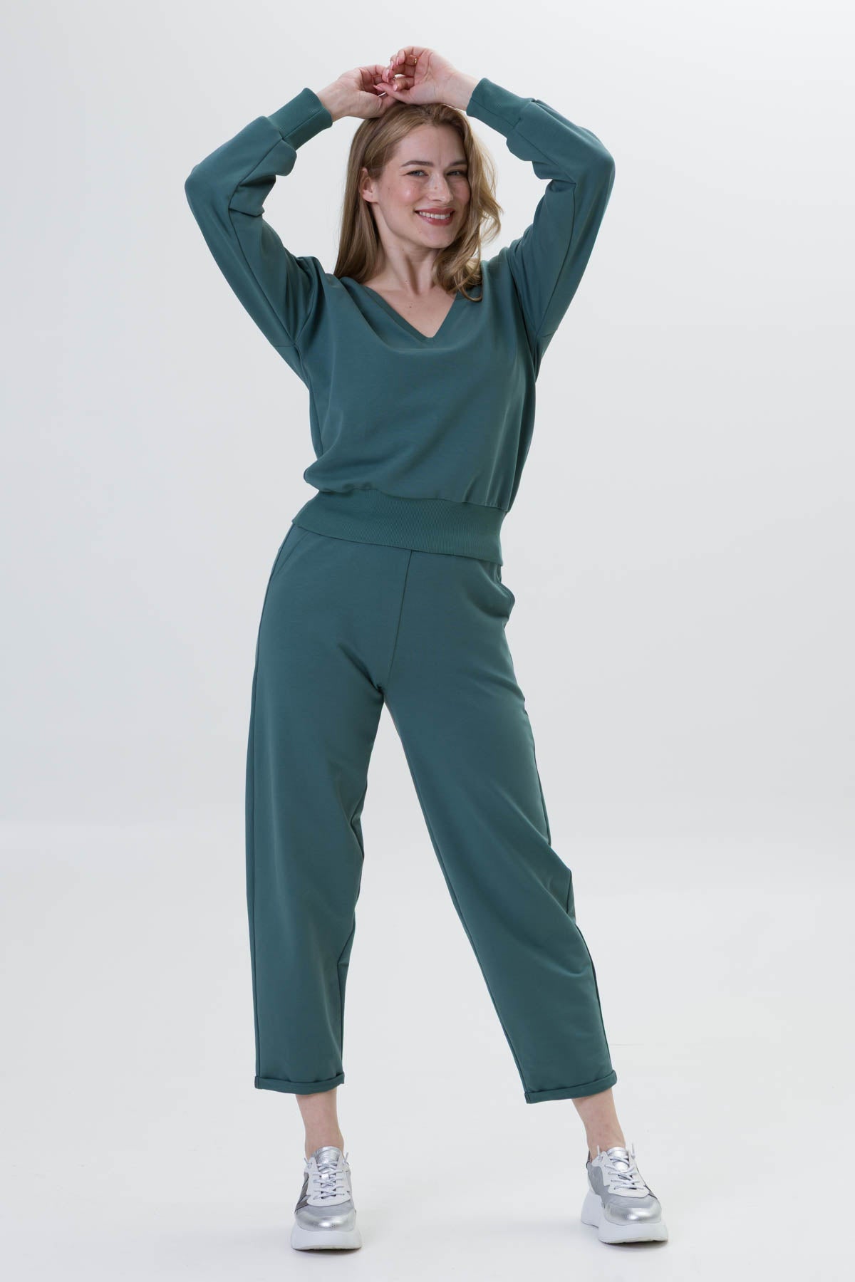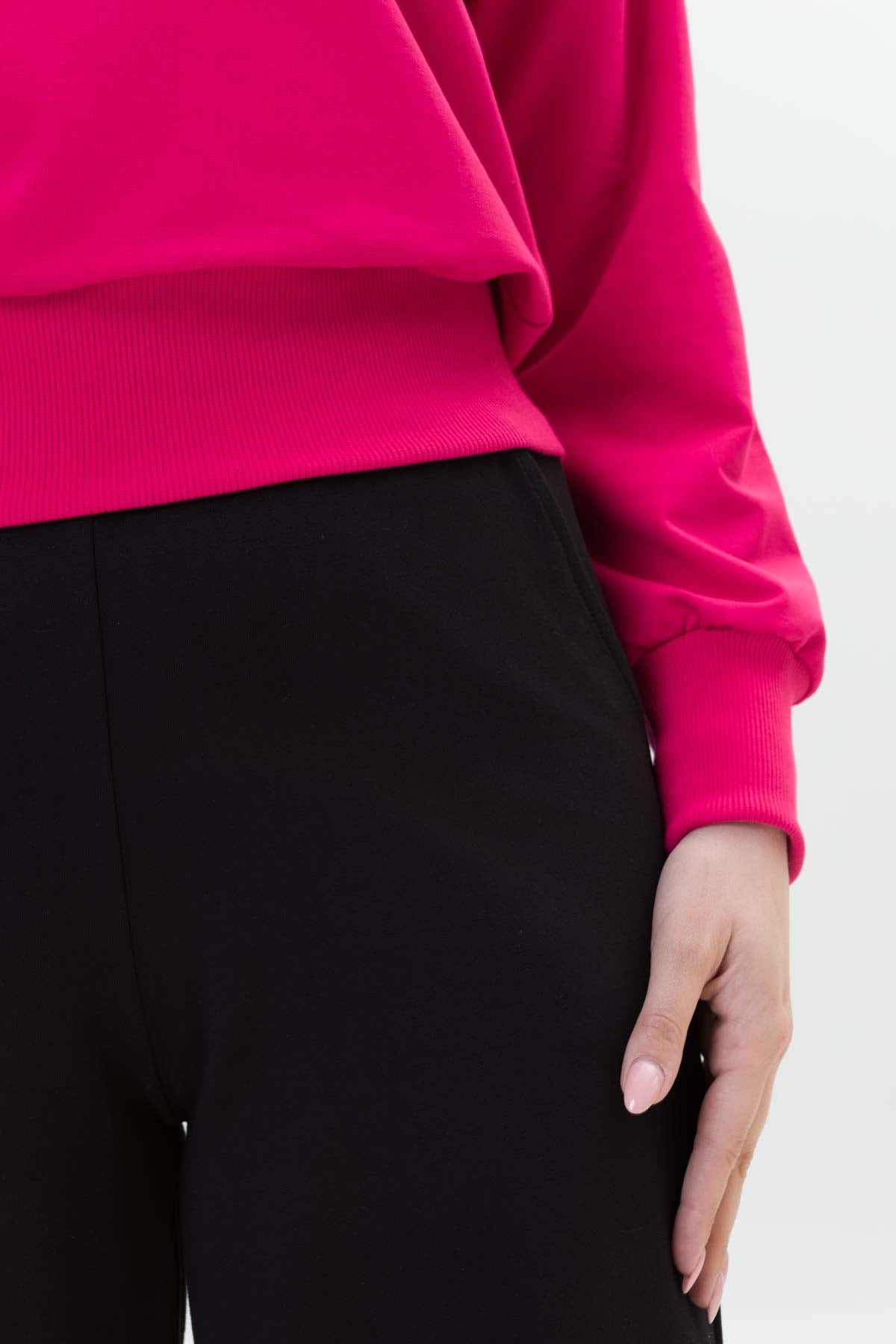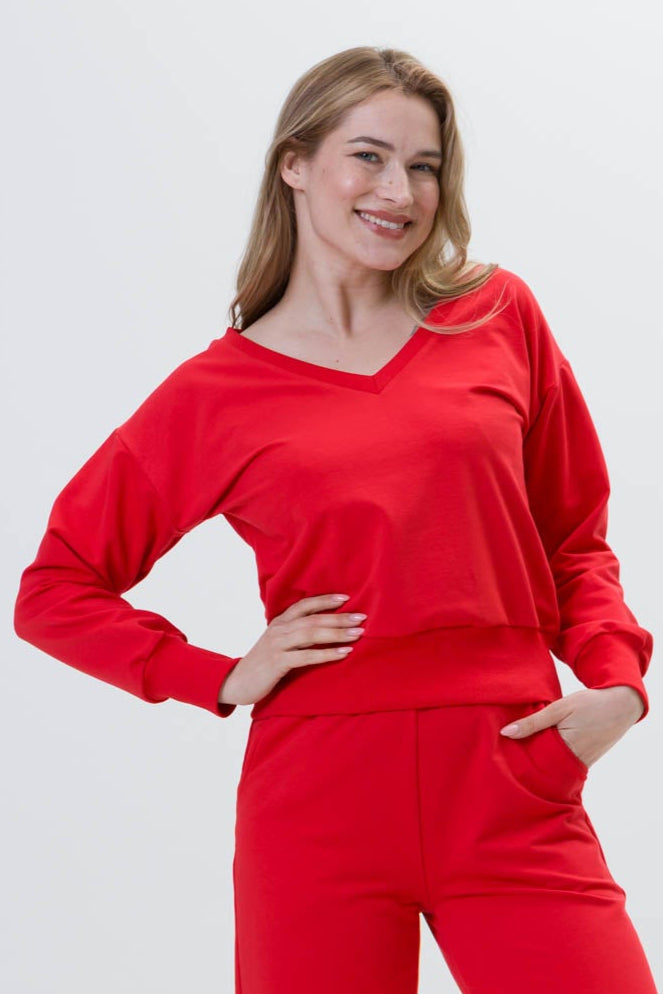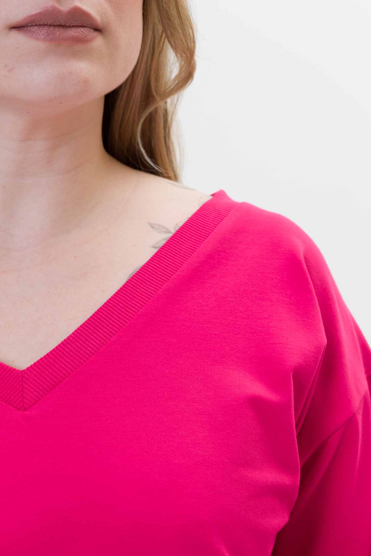 Dekolt w kształcie litery V optycznie wydłuża szyję i dodaje lekkości całej stylizacji, a elastyczne ściągacze przy rękawach, dekolcie i na dole bluzy nadają całości wyrazistego charakteru.
