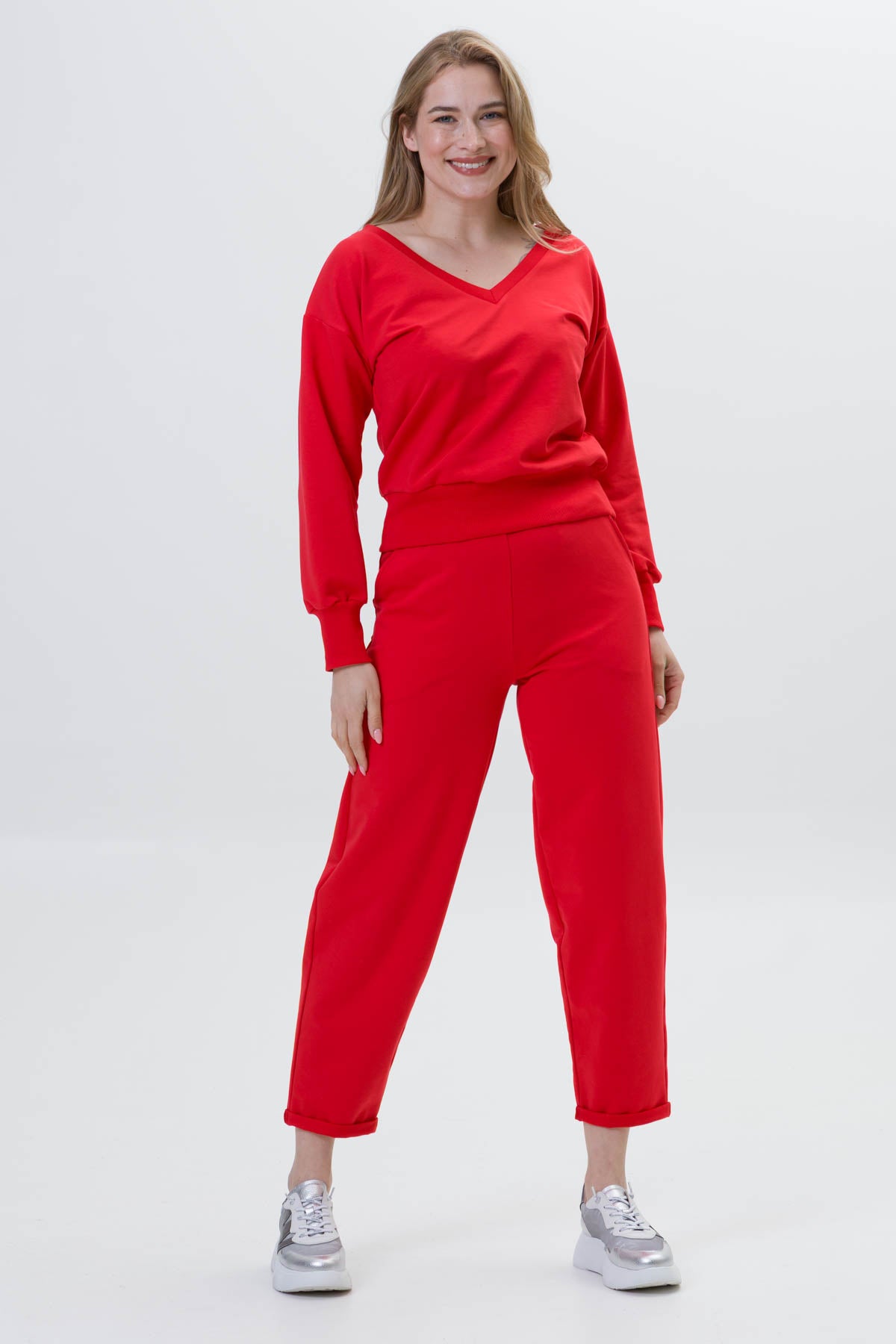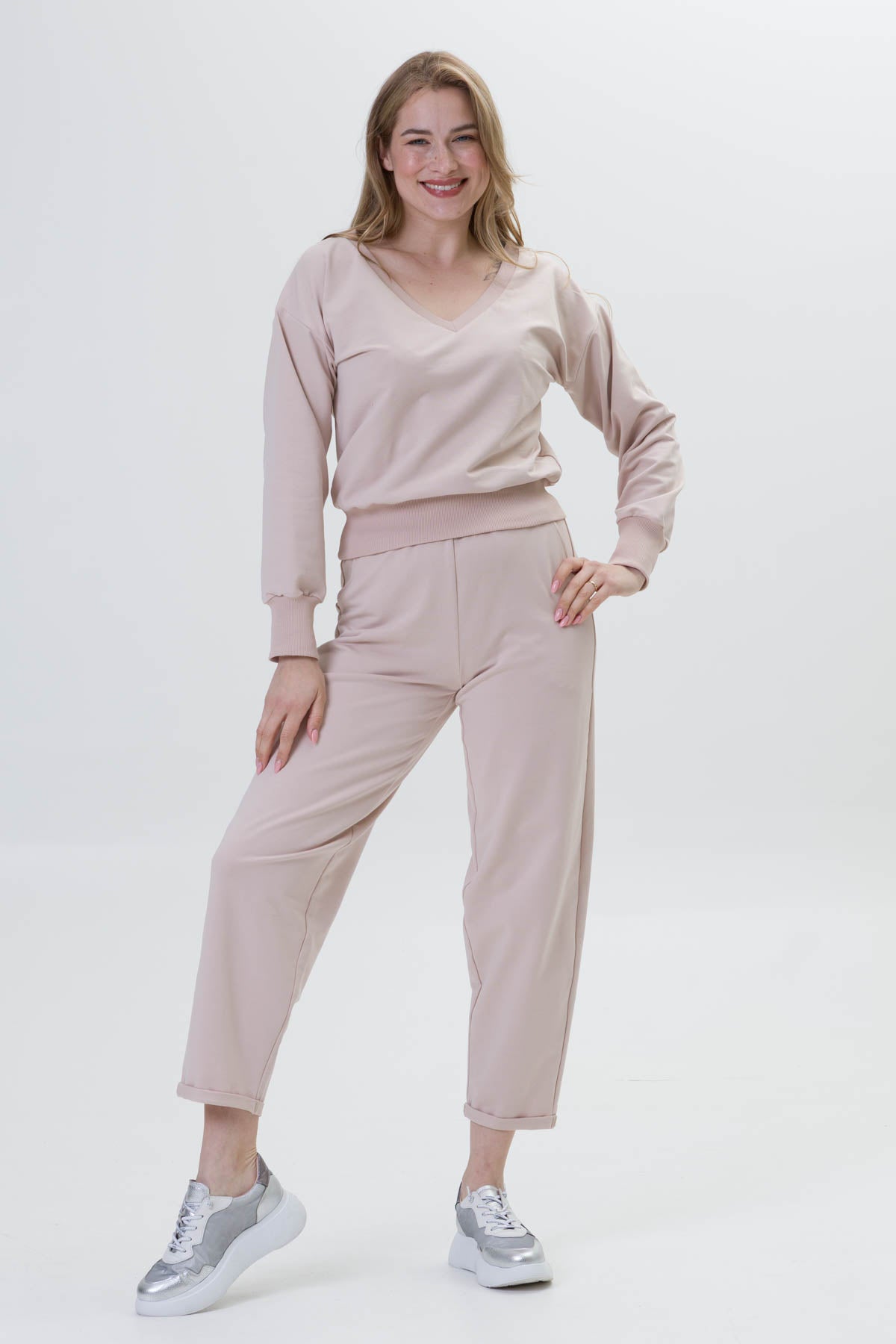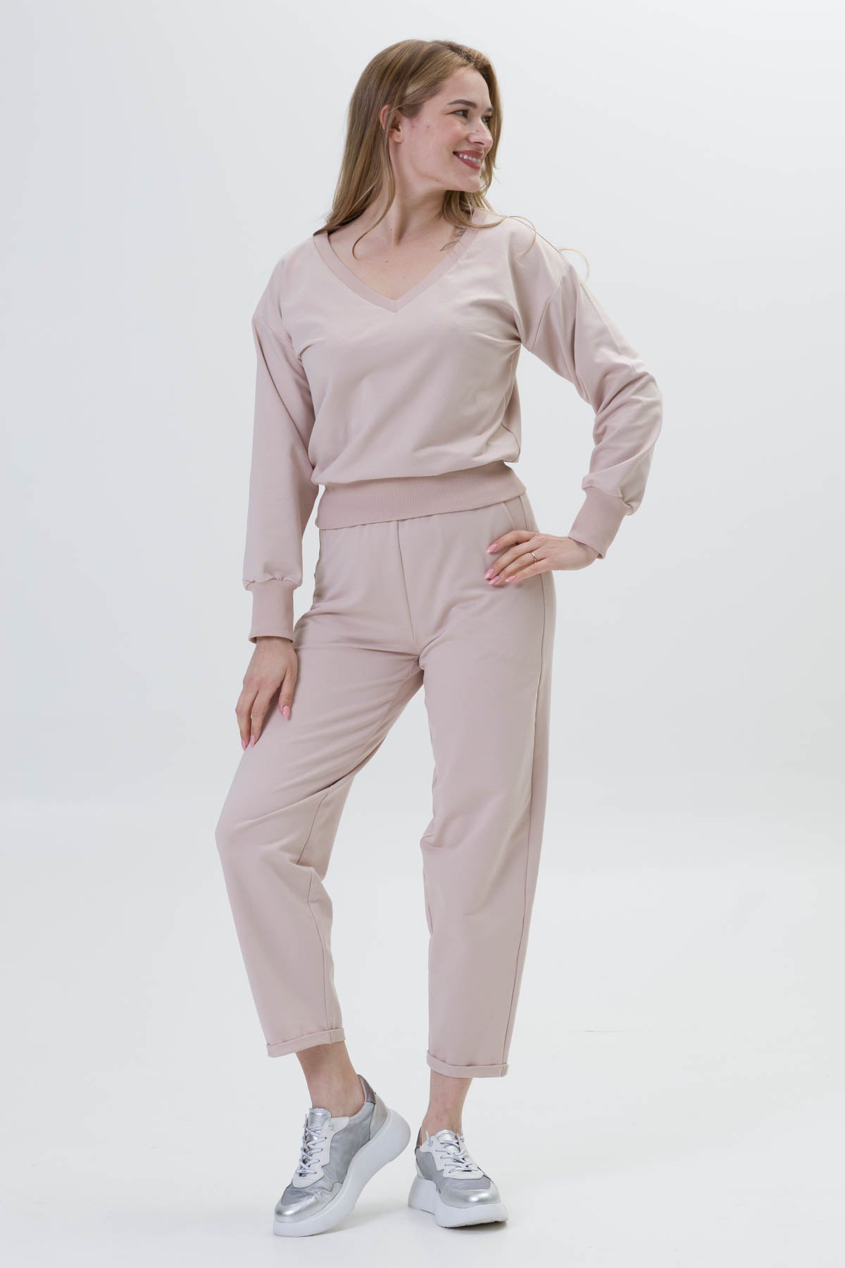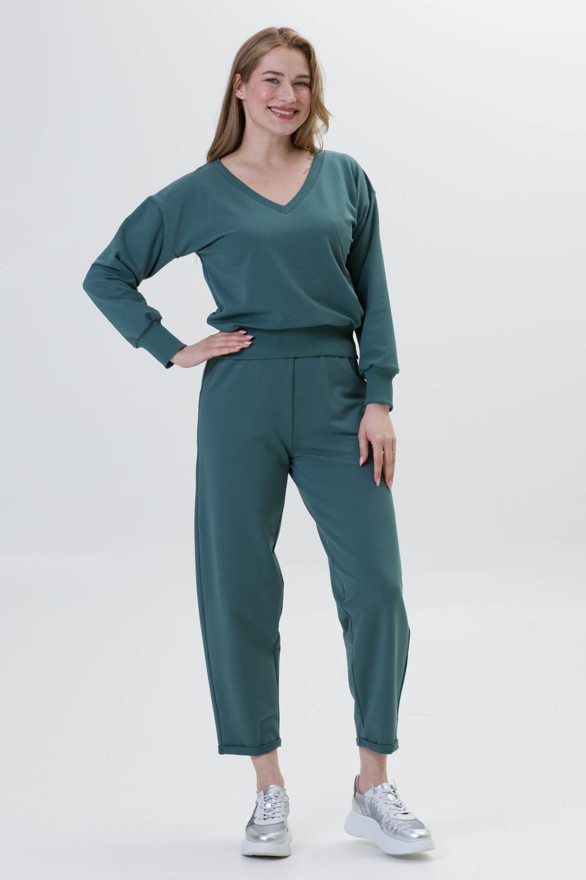 Dekolt w kształcie litery V optycznie wydłuża szyję i dodaje lekkości całej stylizacji, a elastyczne ściągacze przy rękawach, dekolcie i na dole bluzy nadają całości wyrazistego charakteru.