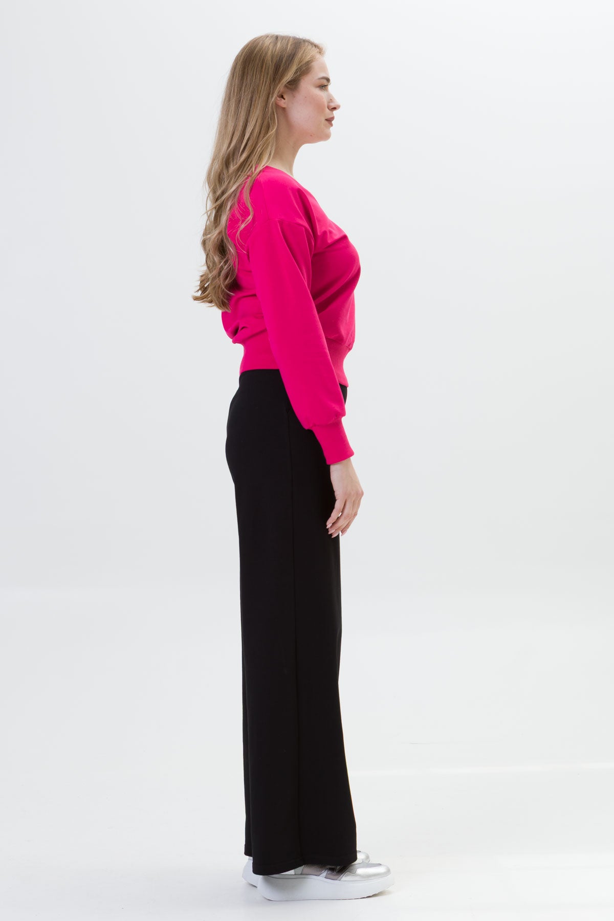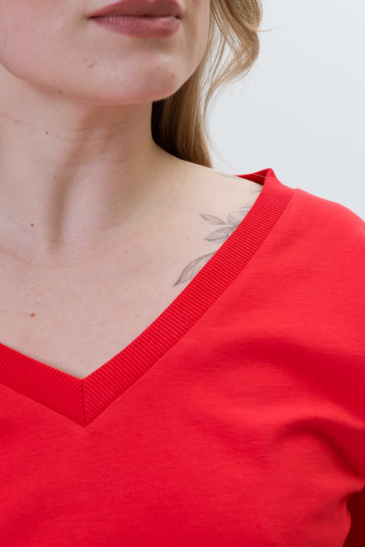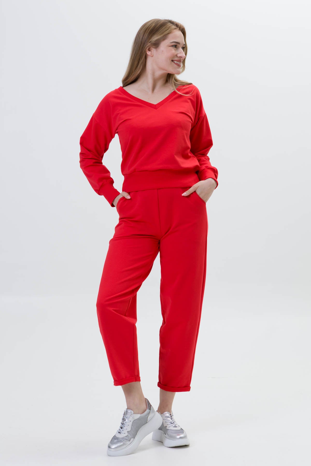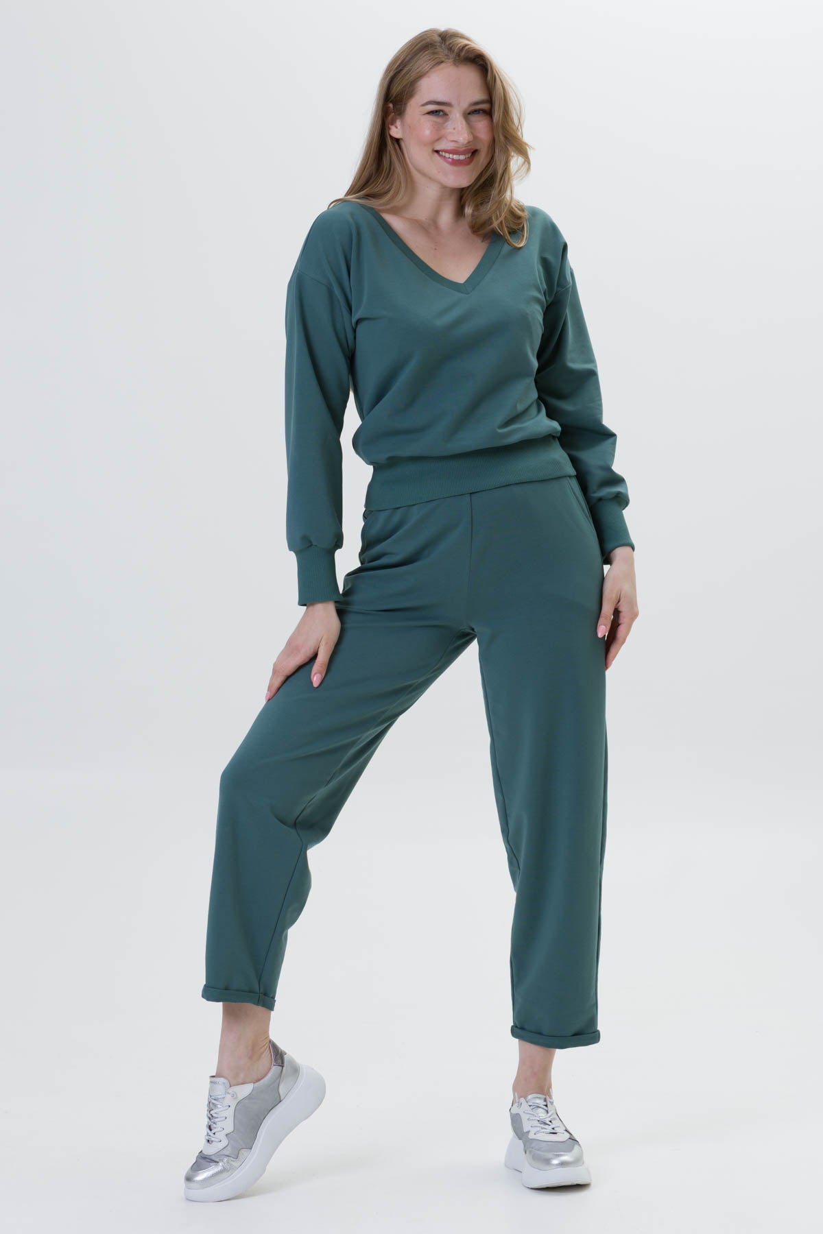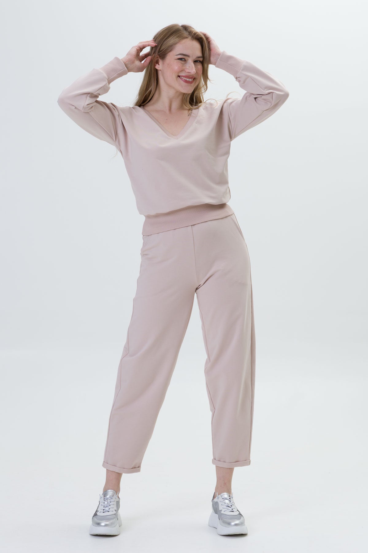 Dekolt w kształcie litery V optycznie wydłuża szyję i dodaje lekkości całej stylizacji, a elastyczne ściągacze przy rękawach, dekolcie i na dole bluzy nadają całości wyrazistego charakteru.