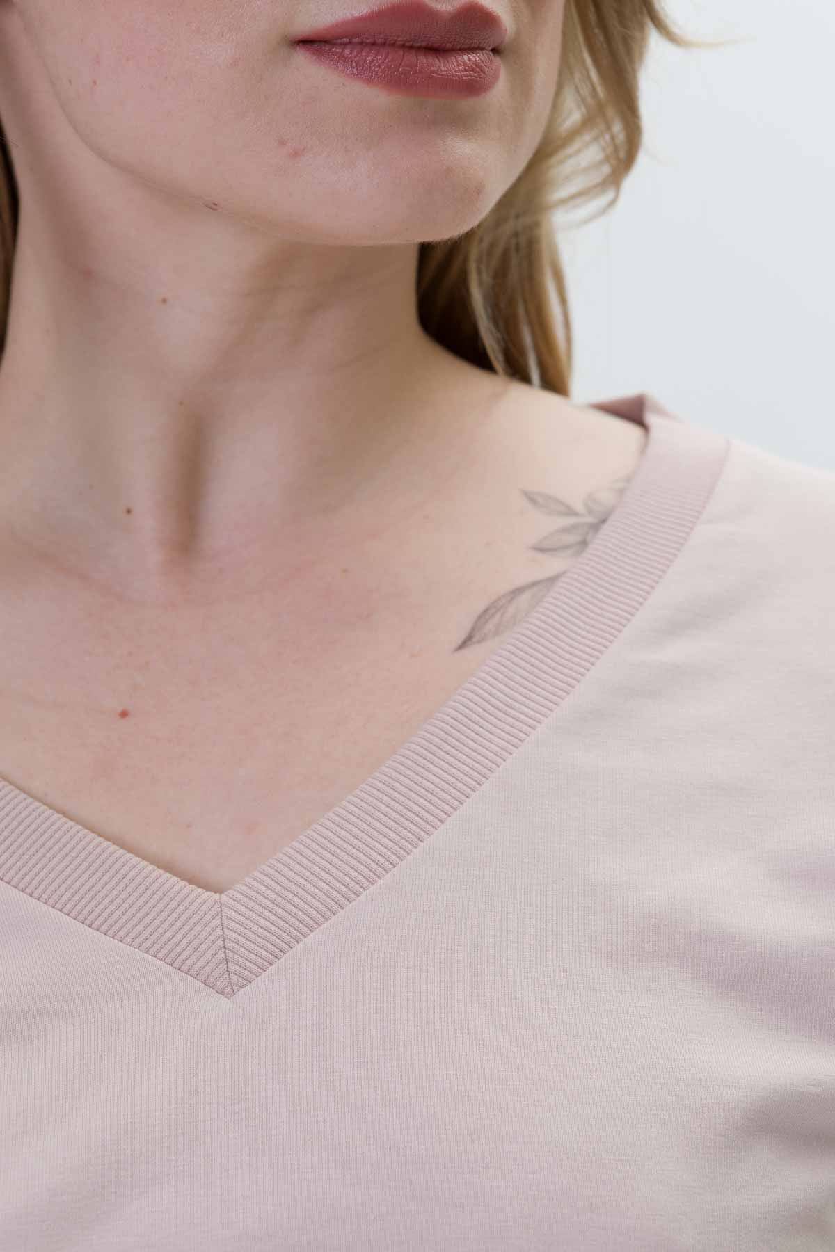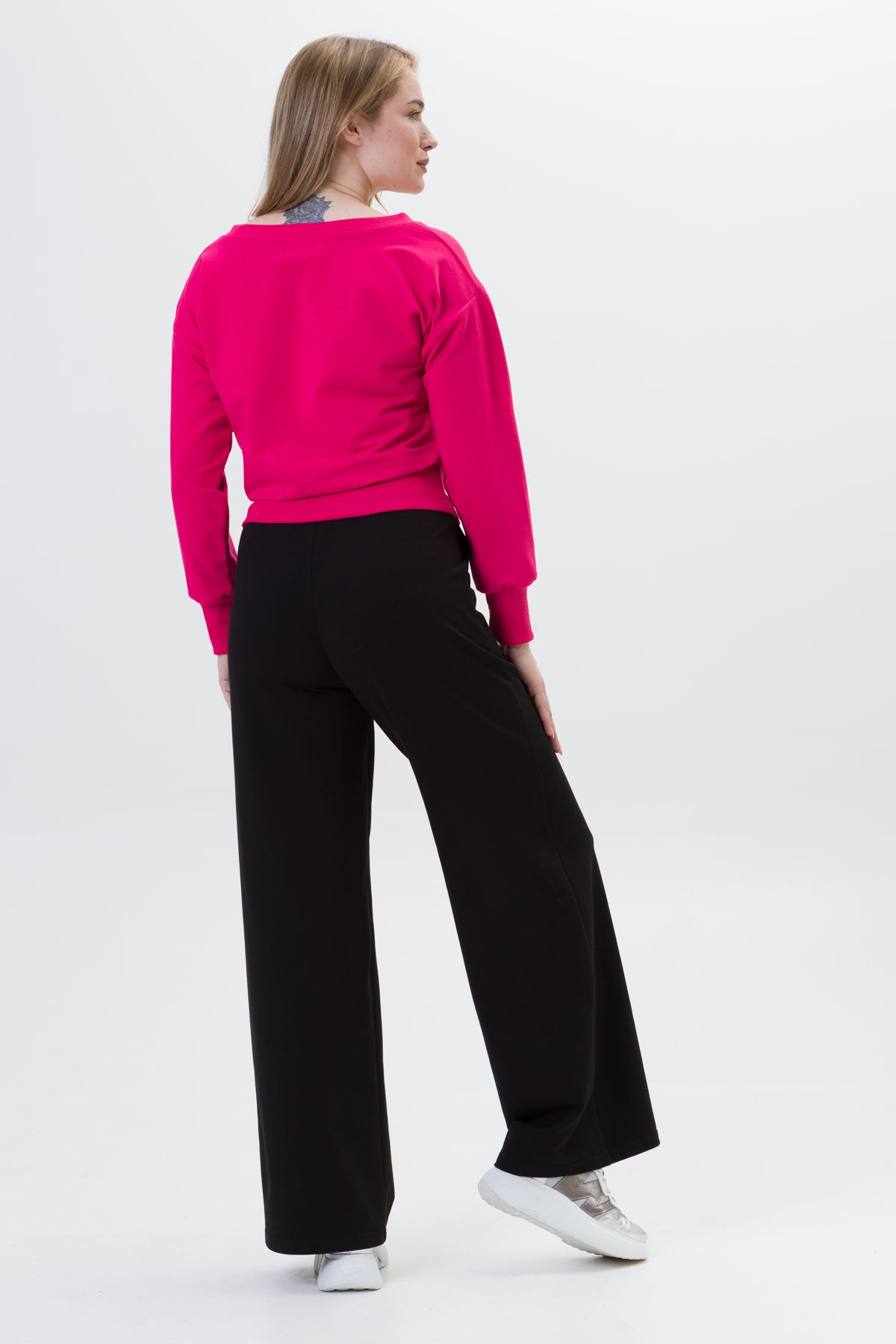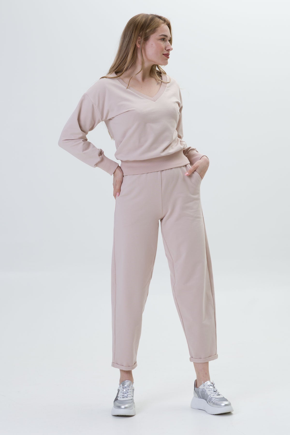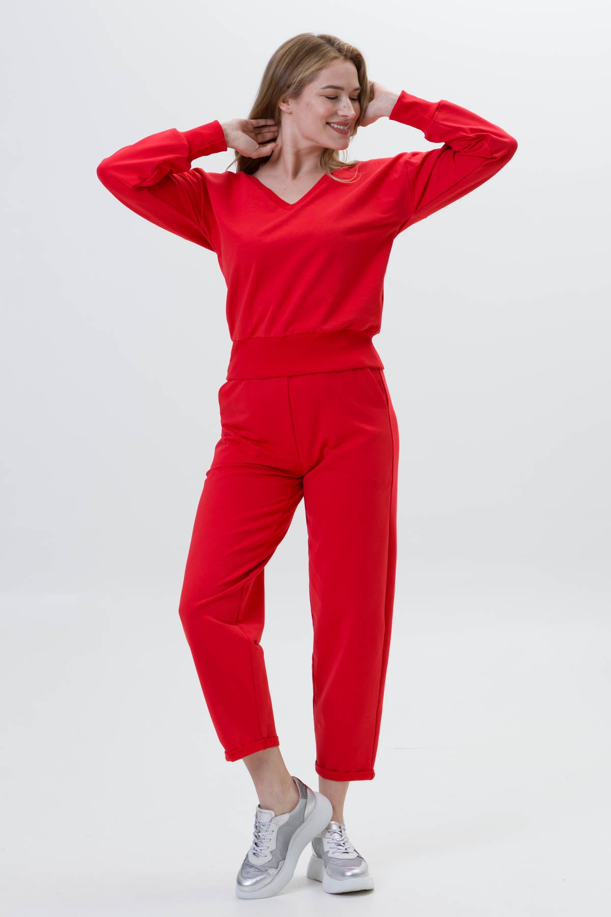 Dekolt w kształcie litery V optycznie wydłuża szyję i dodaje lekkości całej stylizacji, a elastyczne ściągacze przy rękawach, dekolcie i na dole bluzy nadają całości wyrazistego charakteru.