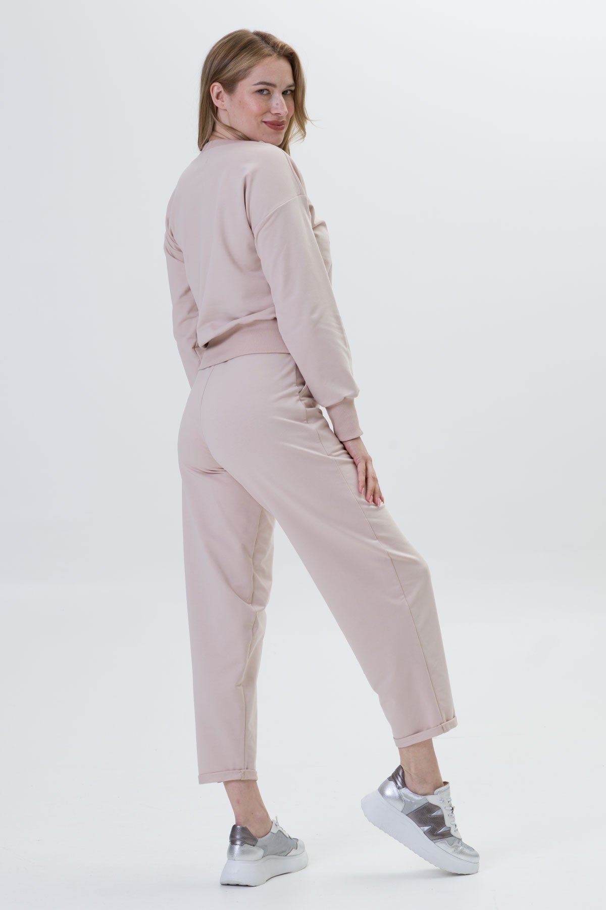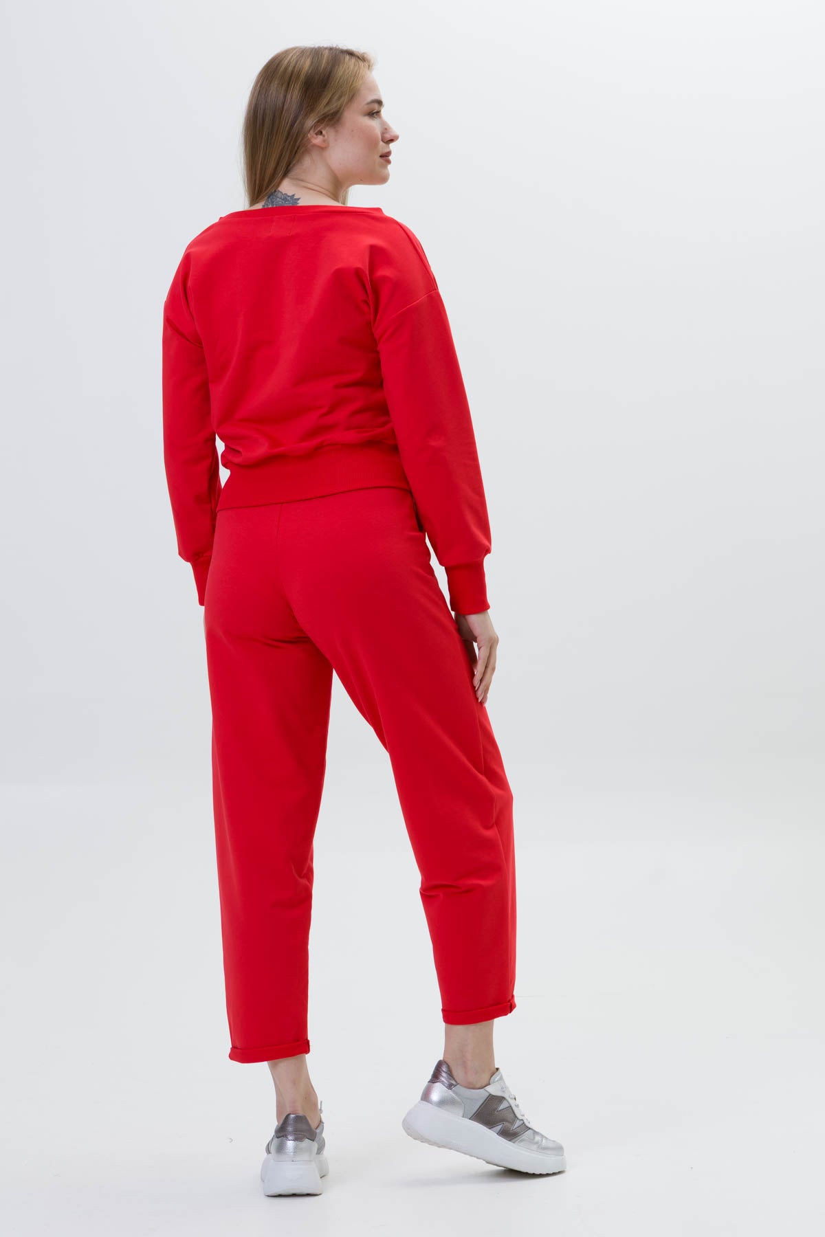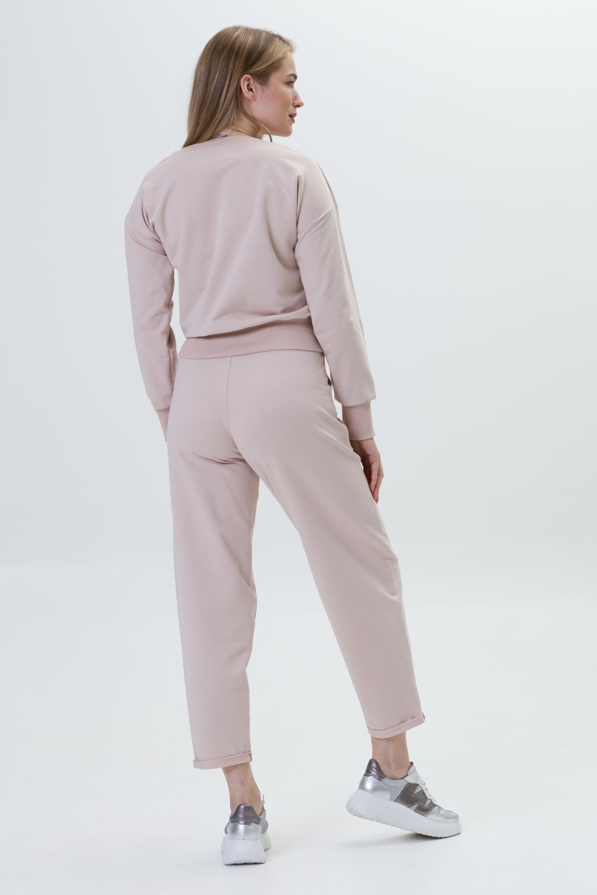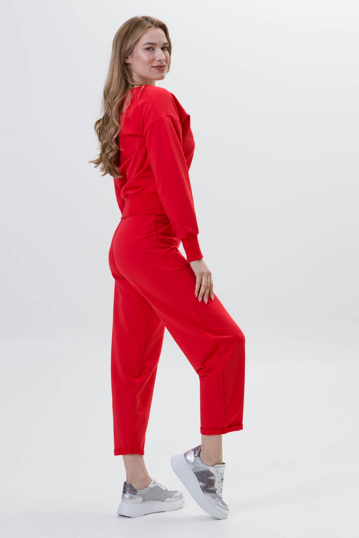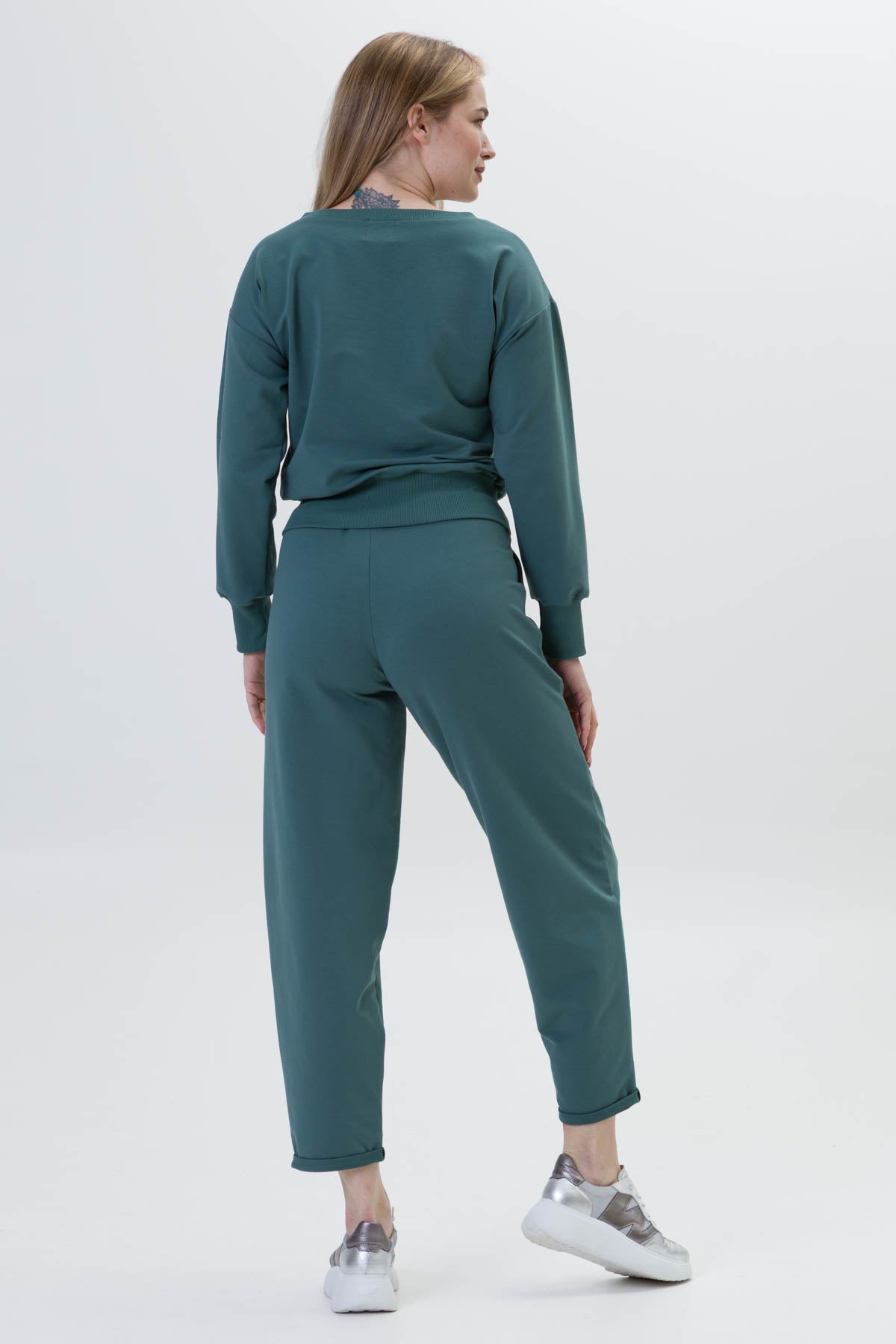 Dekolt w kształcie litery V optycznie wydłuża szyję i dodaje lekkości całej stylizacji, a elastyczne ściągacze przy rękawach, dekolcie i na dole bluzy nadają całości wyrazistego charakteru.