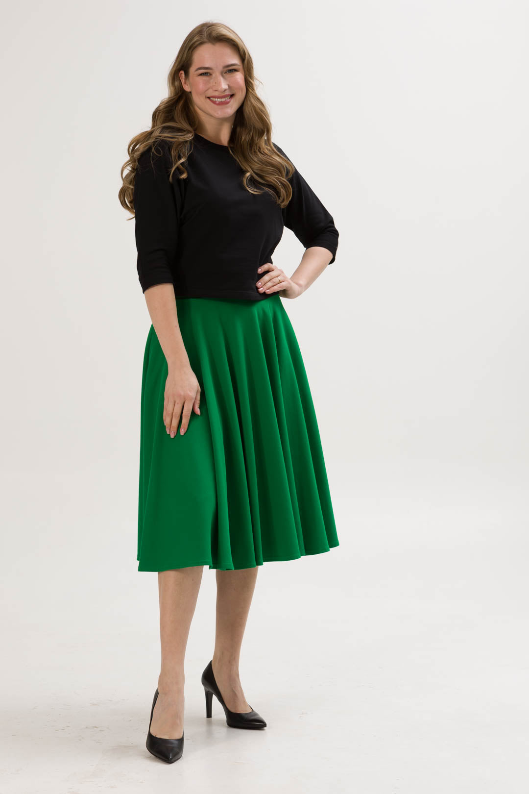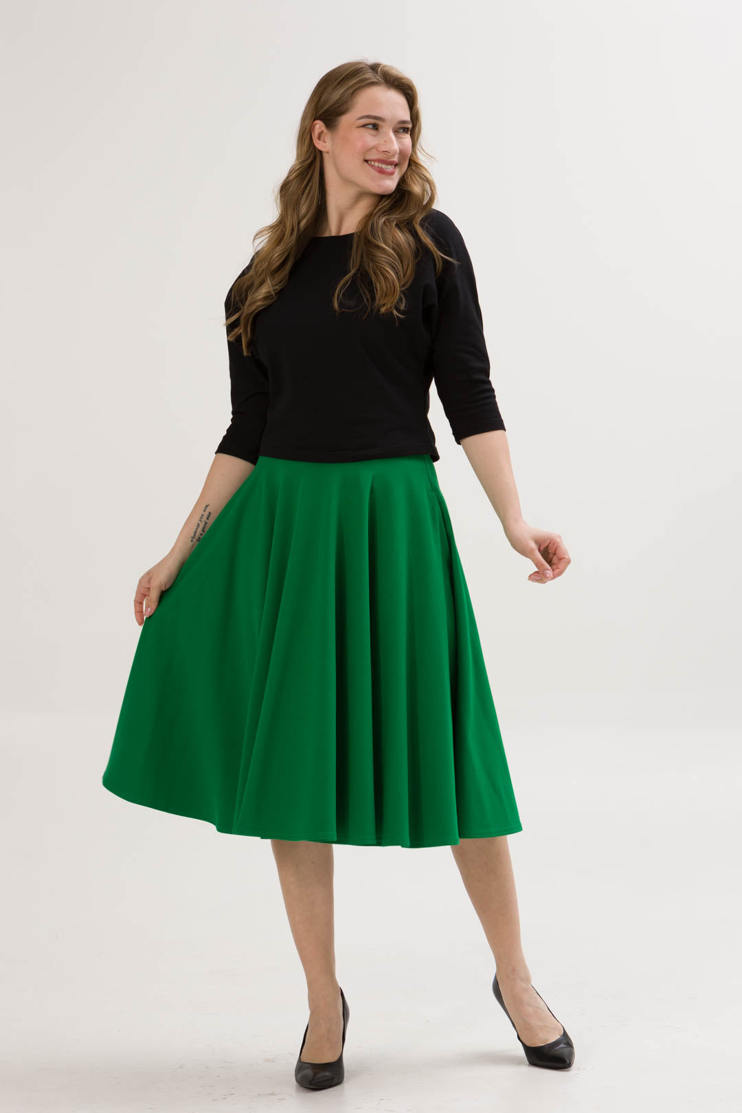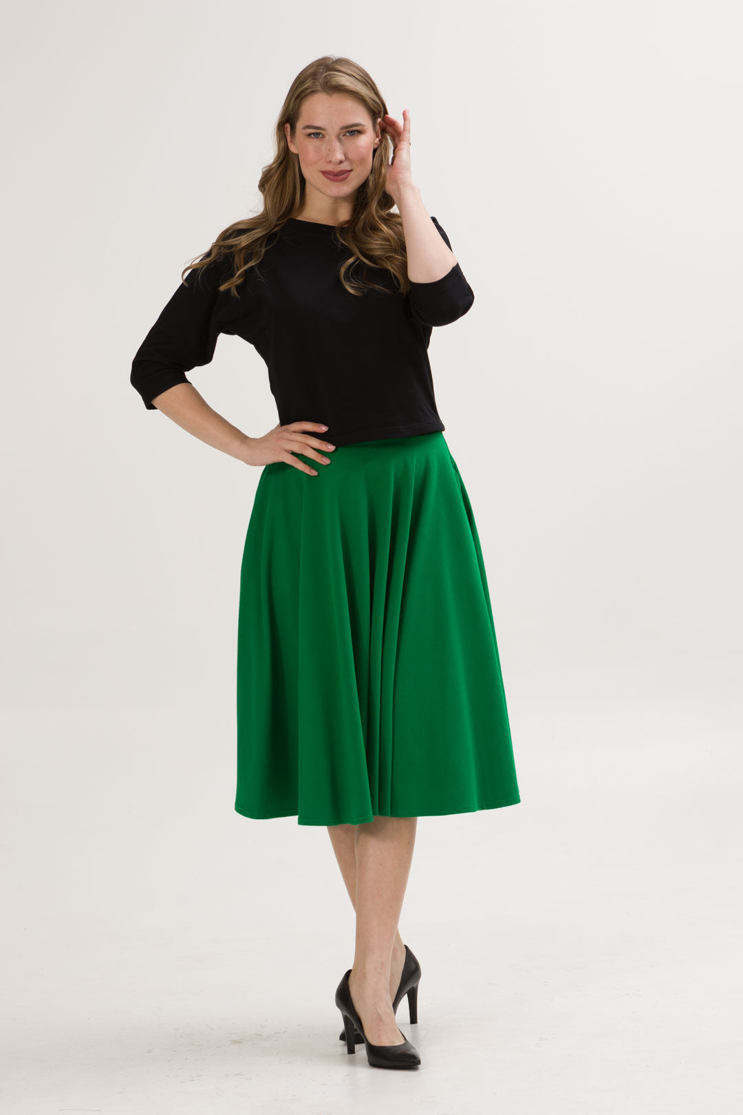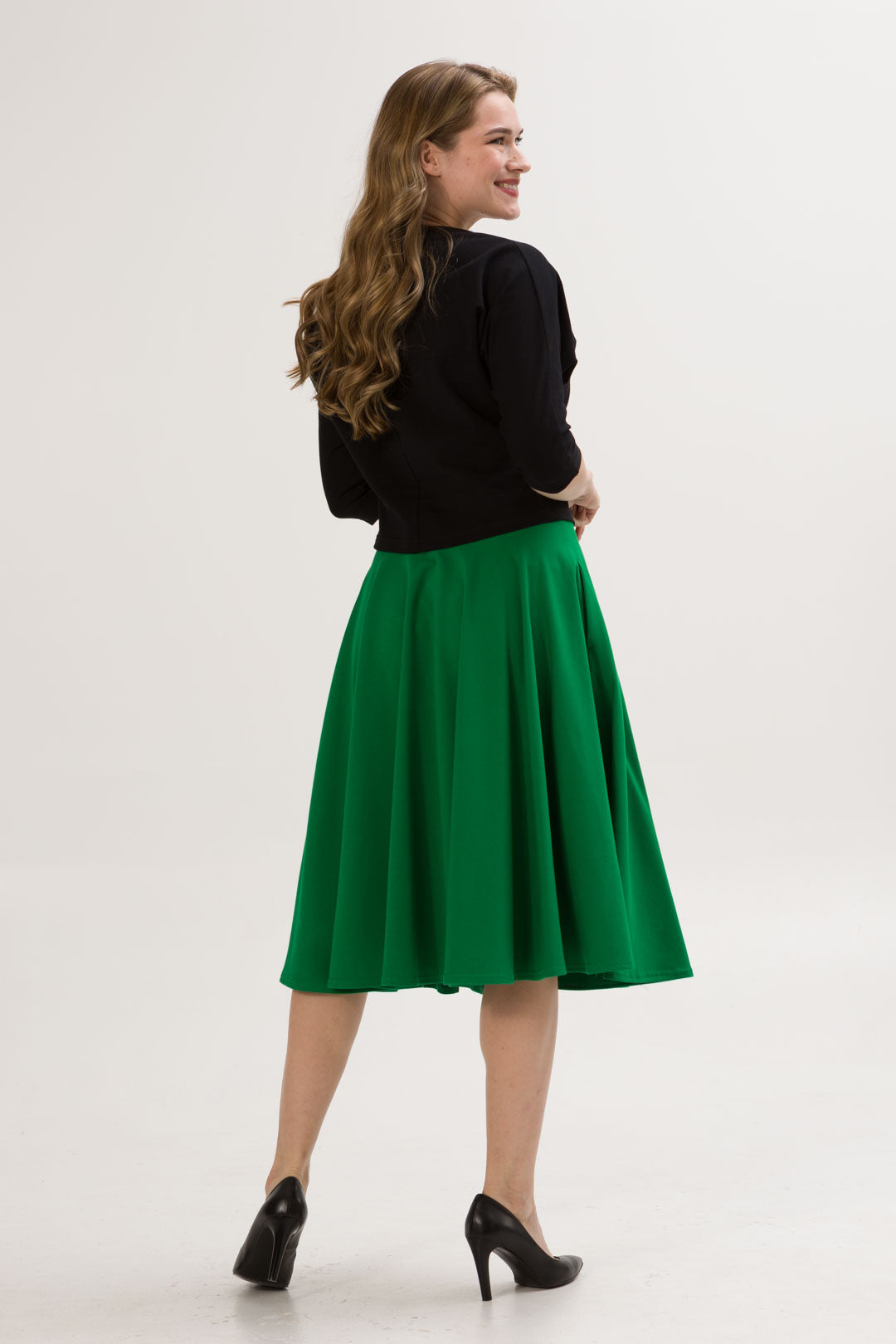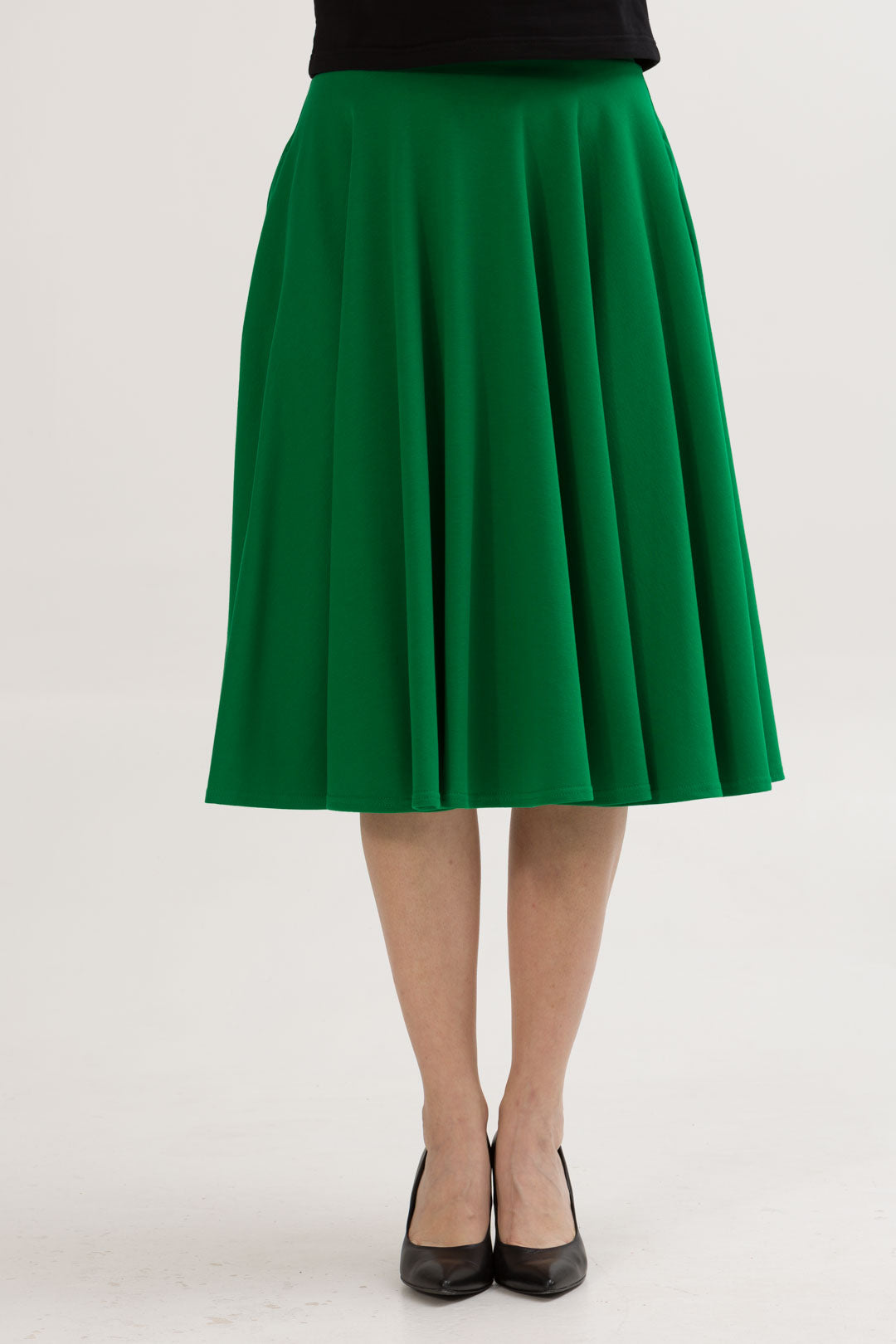 - To klasyczna spódnica z pełnego koła, sięgająca za kolano – nieodzowny element garderoby każdej kobiety ceniącej styl i funkcjonalność. Dzięki temu modelowi zawsze znajdziesz idealną stylizację na każdą okazję.