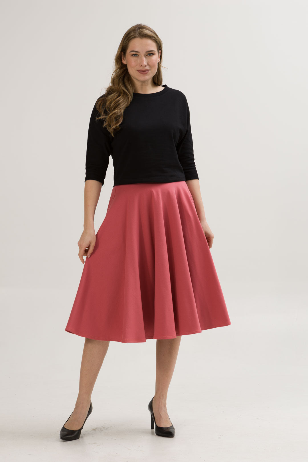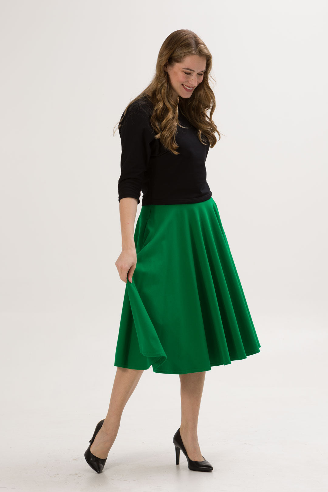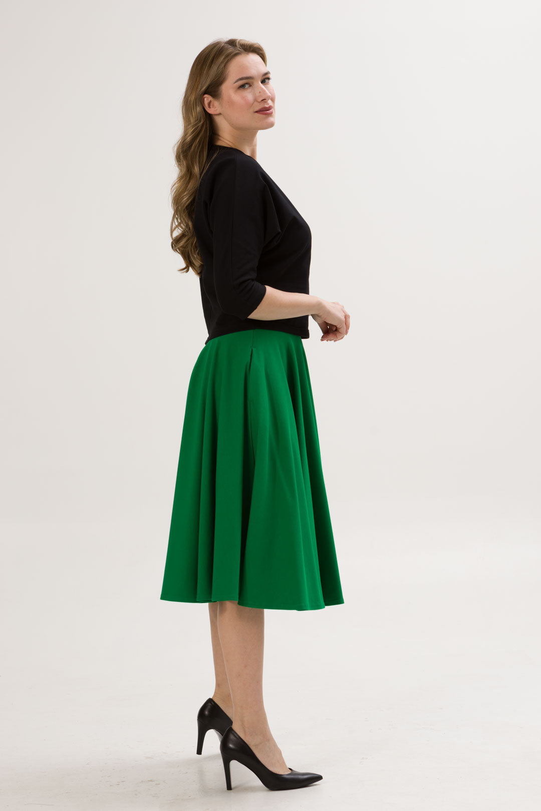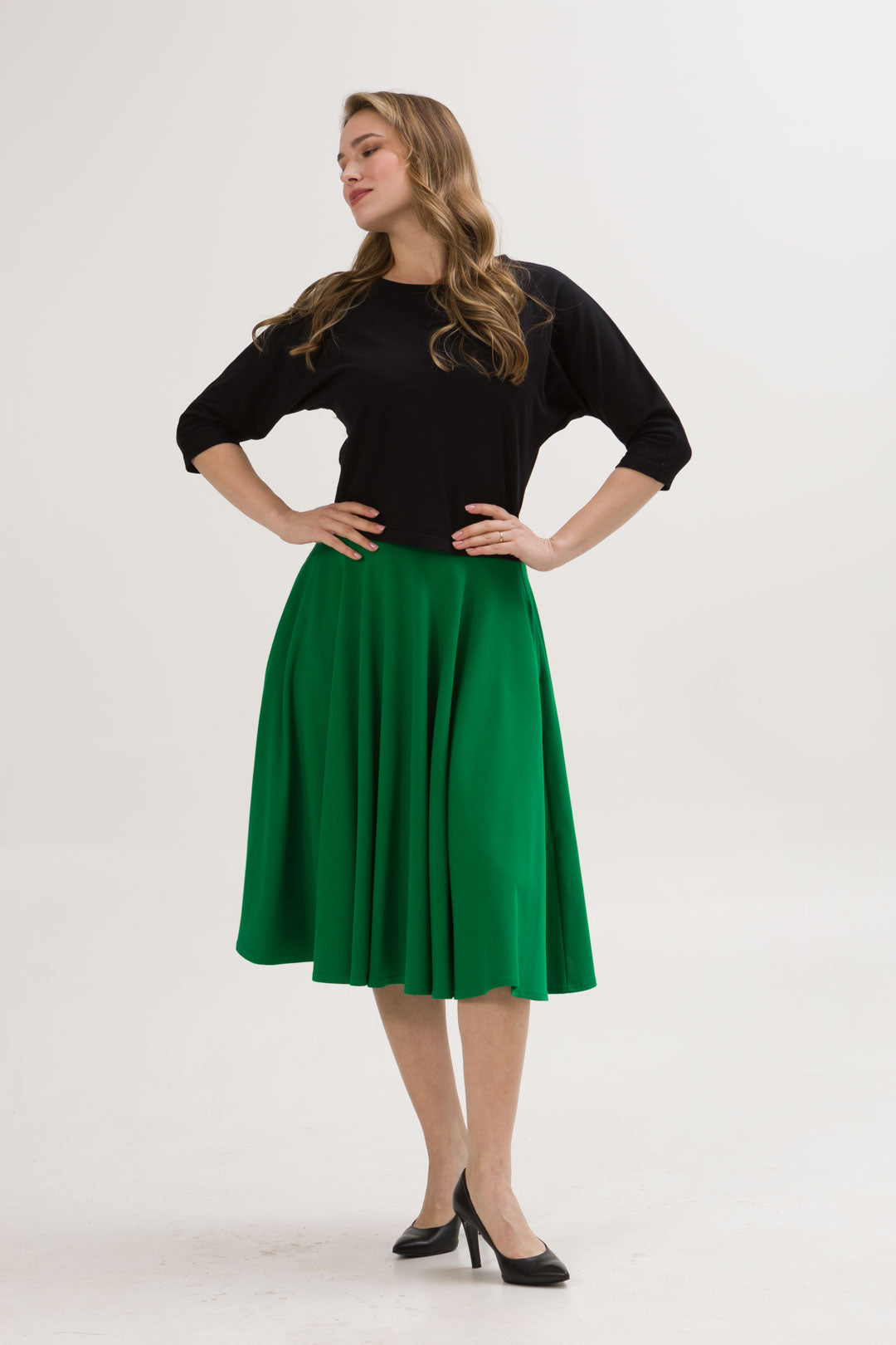 - To klasyczna spódnica z pełnego koła, sięgająca za kolano – nieodzowny element garderoby każdej kobiety ceniącej styl i funkcjonalność. Dzięki temu modelowi zawsze znajdziesz idealną stylizację na każdą okazję.