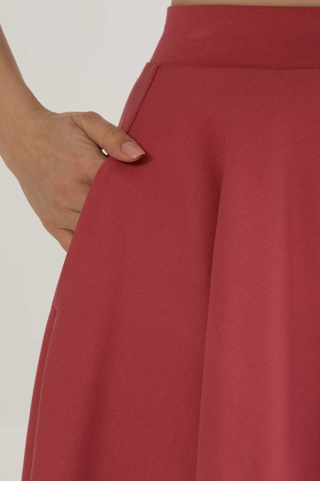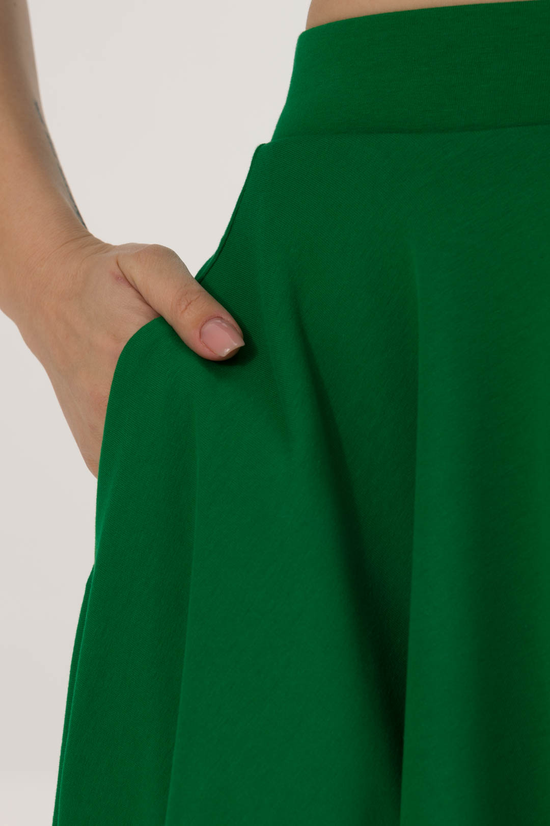 Wyjątkowy fason z pełnego koła subtelnie porusza się przy każdym kroku, dodając lekkości i elegancji. W bocznych szwach ukryte są praktyczne kieszenie, a elastyczna guma w pasie zapewnia wygodę i doskonałe dopasowanie.